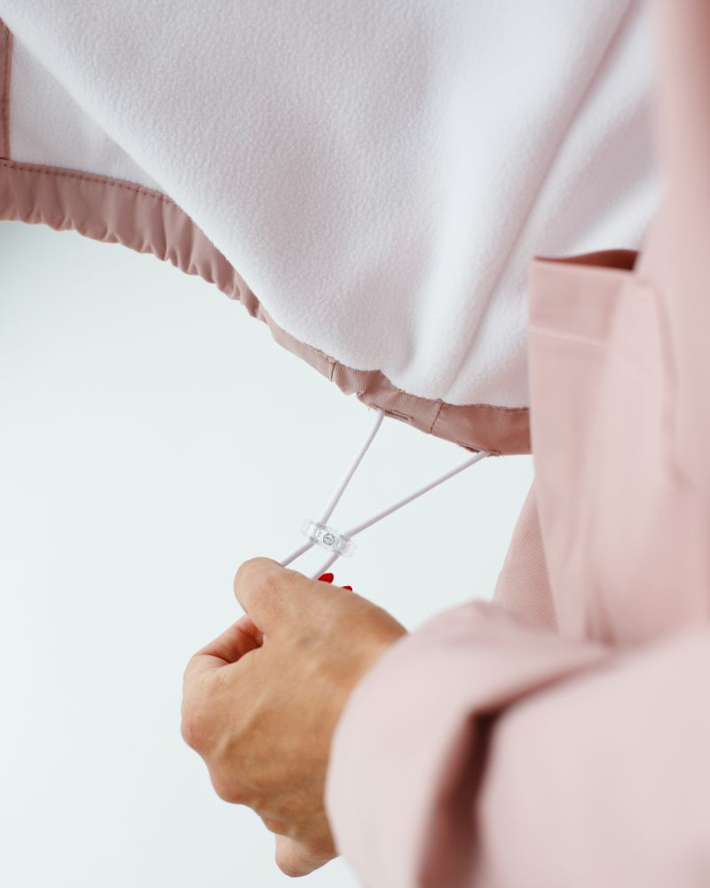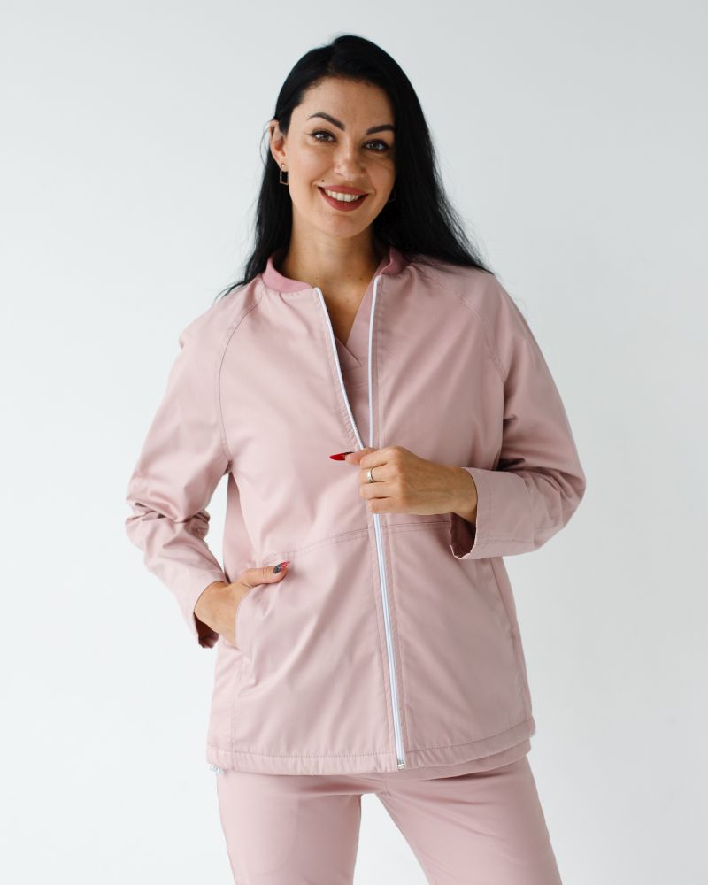 Має вільний силует, комірець із трикотажною стійкою, рукав-реглан, кишені та застібається на блискавку.