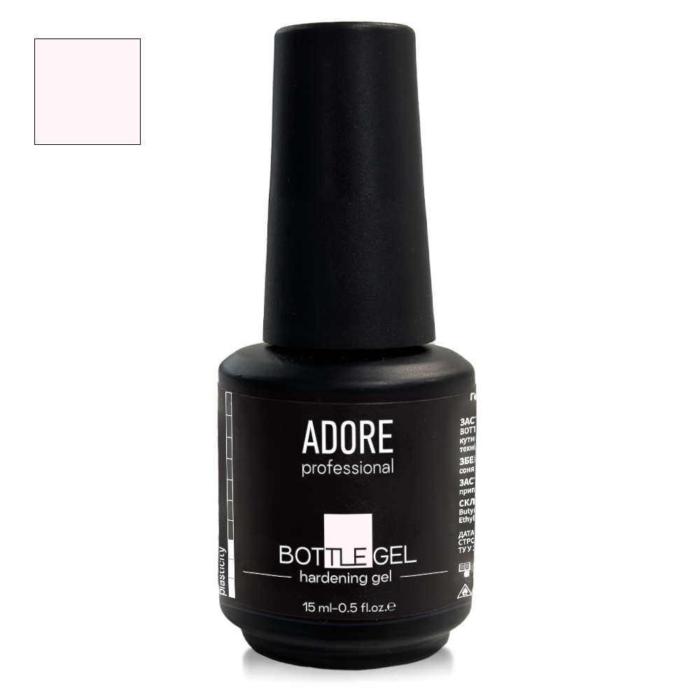 Adore Professional Bottle Gel - камуфлюючий гель середньої густоти. Дозволяє зміцнювати нігті до середньої довжини. Є ідеальним матеріалом для техніки "без опила", а також успішно використовується в комбінованих техніках у поєднанні з твердішими матеріалами-полімерами. Крім того, цей гель може бути самостійним напівпрозорим кольором у декоративному манікюрі або виконувати функцію додаткового зміцнюючого шару перед нанесенням гель-лаку.
