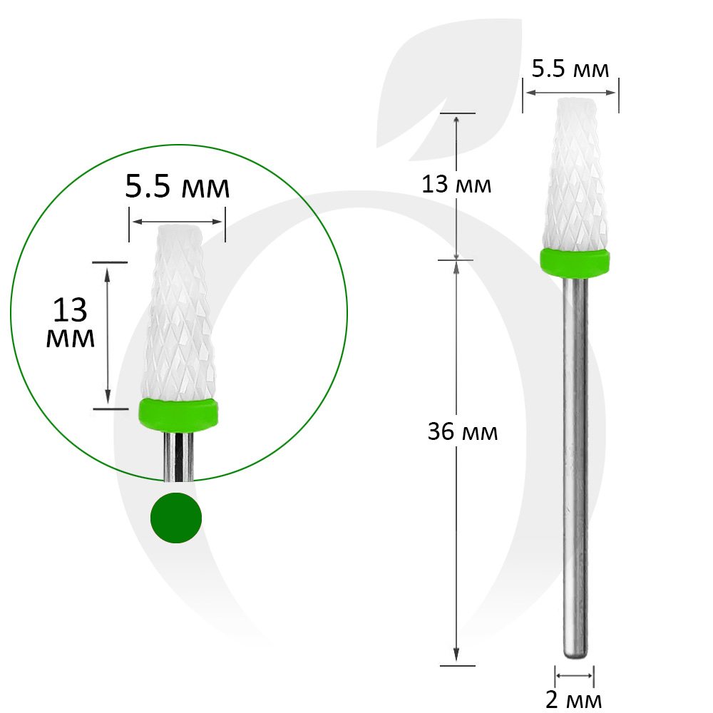 Фреза керамічна конус зелена 5.5 мм, робоча частина 13 мм