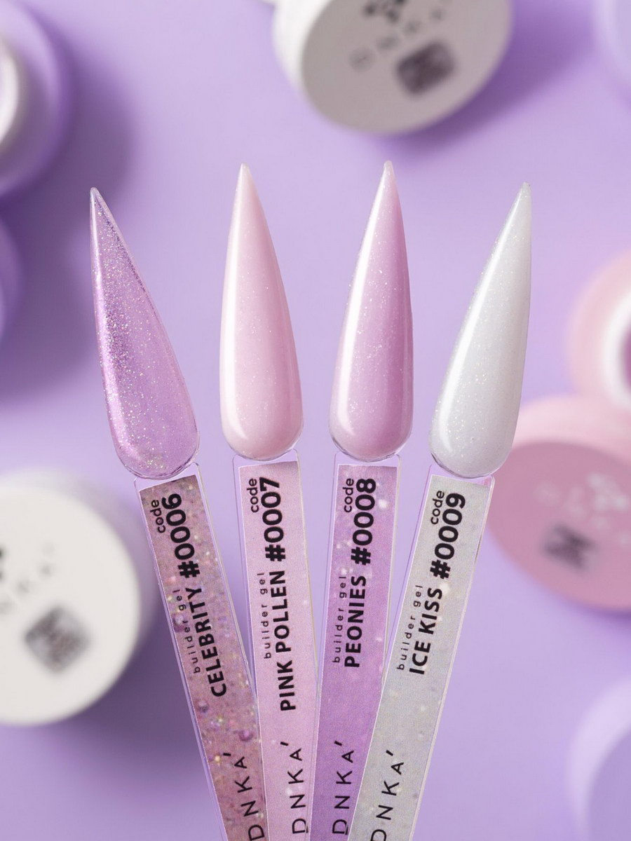 DNKa’ Builder Gel Shimmer — унікальна колекція трьохфазних гелів з мерехтливими частинками. Високоадгезивний низькотемпературний моделюючий гель найвищої якості. Має середню консистенцію, рівномірно розподіляється і самовирівнюється. Дуже зручний у роботі, підходить для майстрів будь-якого рівня професіоналізму. Твердий гель дозволяє створити міцне покриття, забезпечити відповідну архітектуру, прекрасно тримає арку і не деформується під час носіння. Підходить для нарощування на нижню форму, нарощування у техніці без або з мінімальним спилюванням, корекції, моделювання нігтьової пластини та зміцнення нігтів. Пігментація гелів колекції Shimmer варіюється від 0% (clear) до 98% (cover).