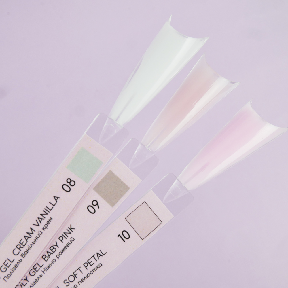 Спосіб застосування: на підготовлений ніготь викладається шпателем у вигляді кульки, потім за допомогою плаского синтетичного пензлика надається потрібна форма. Пензлик потрібно вмочити в рідину для полігелю. На поверхню сформованого штучного нігтя наноситься фінішне покриття. Знімається полігель спилюванням, він не розчиняється.