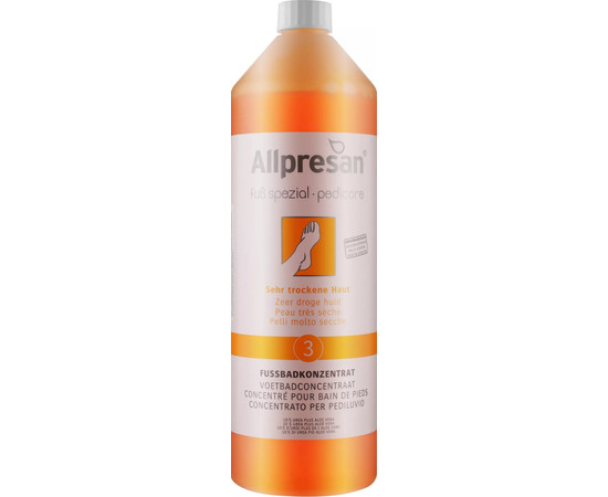 Концентрат №3 торгової марки Allpresan ідеально підходить для догляду за проблемною та чутливою шкірою. Склад, збагачений АНА-кислотами, екстрактом алое віра та сечовиною, чудово впорається з підвищеною сухістю шкірного покриву. Має заспокійливі та розслаблюючі властивості, делікатно очищає епідерміс, залишаючи шкіру після процедури глибоко зволоженою, гладкою та еластичною. Запобігає грибковим захворюванням. Свіжий аромат персика дарує відчуття розслабленості, знімаючи стрес та втому після важкого дня. Концентрат №3 для ванни Allpresan протестовано дерматологами. Не містить консервантів. Рекомендується для оздоровлення дуже сухої шкіри та діабетичної стопи.