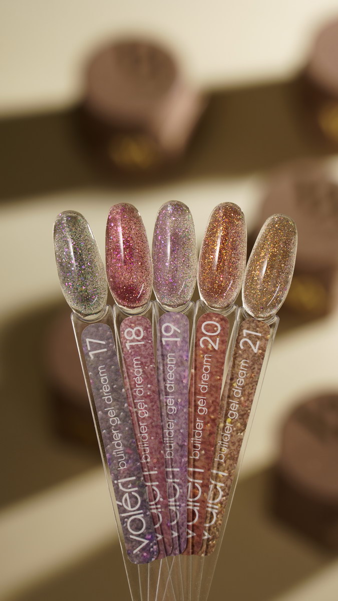 Valeri Builder Gel Dream Collection – це колекція гелів, які використовуються як для нарощення нігтів, так і для корекції й укріплення нігтьової пластини. Це середньотемпературний гель з високим ступенем адгезії, твердий, середньої густини (ближче до густої) за рахунок чого дуже добре самовирівнюється, але не затікає. Пігментація – середня. Легкі у нанесенні та добре тримають арку нігтя.