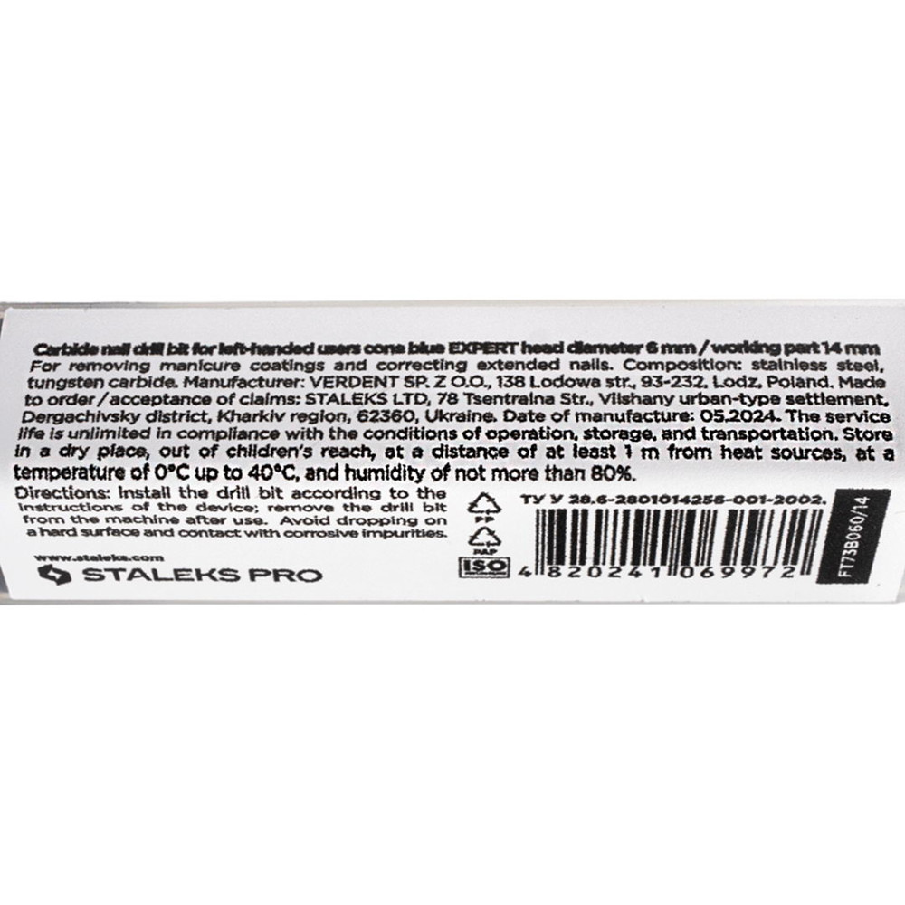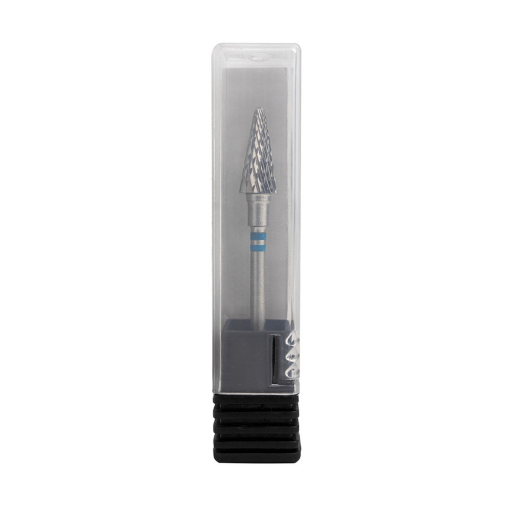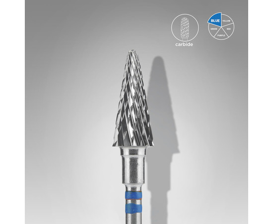 Staleks Pro фреза твердосплавна конус синя насічка для лівші для апаратного манікюру та педикюру — суцільнометалевий інструмент середньої абразивності та середньої жорсткості. Робоча частина — із середньою стандартною хрестоподібною насічкою. Твердосплавні насадки відрізняються тим, що зрізають матеріал, створюючи стружку, а не пил.