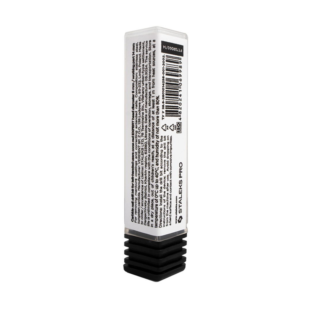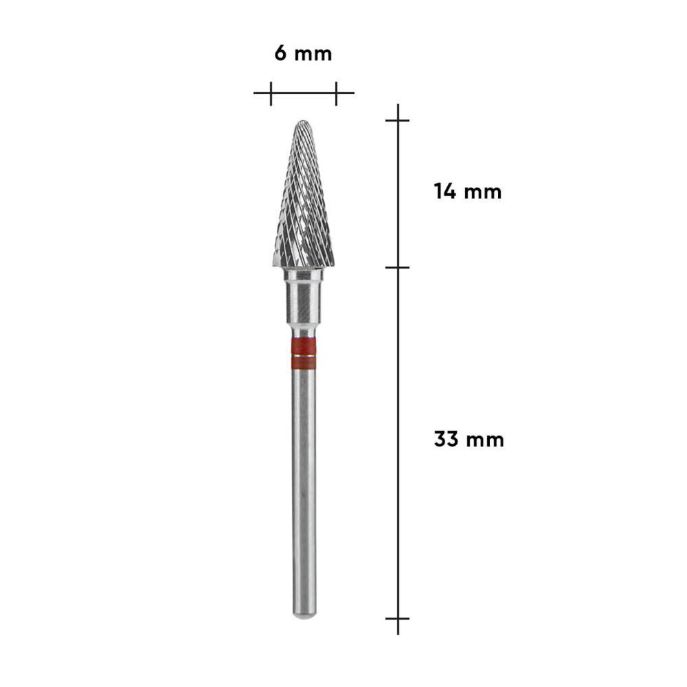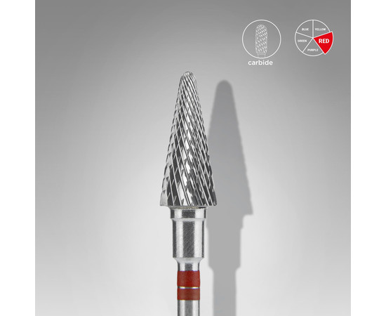 Staleks Pro фреза твердосплавна конус червоний для лівші для апаратного манікюру та педикюру — суцільнометалевий інструмент з червоною насічкою дрібної абразивності та м'якої жорсткості. Робоча частина з дрібною хрестоподібною поперечною насічкою. Твердосплавні насадки відрізняються тим, що зрізають матеріал, створюючи стружку, а не пил.