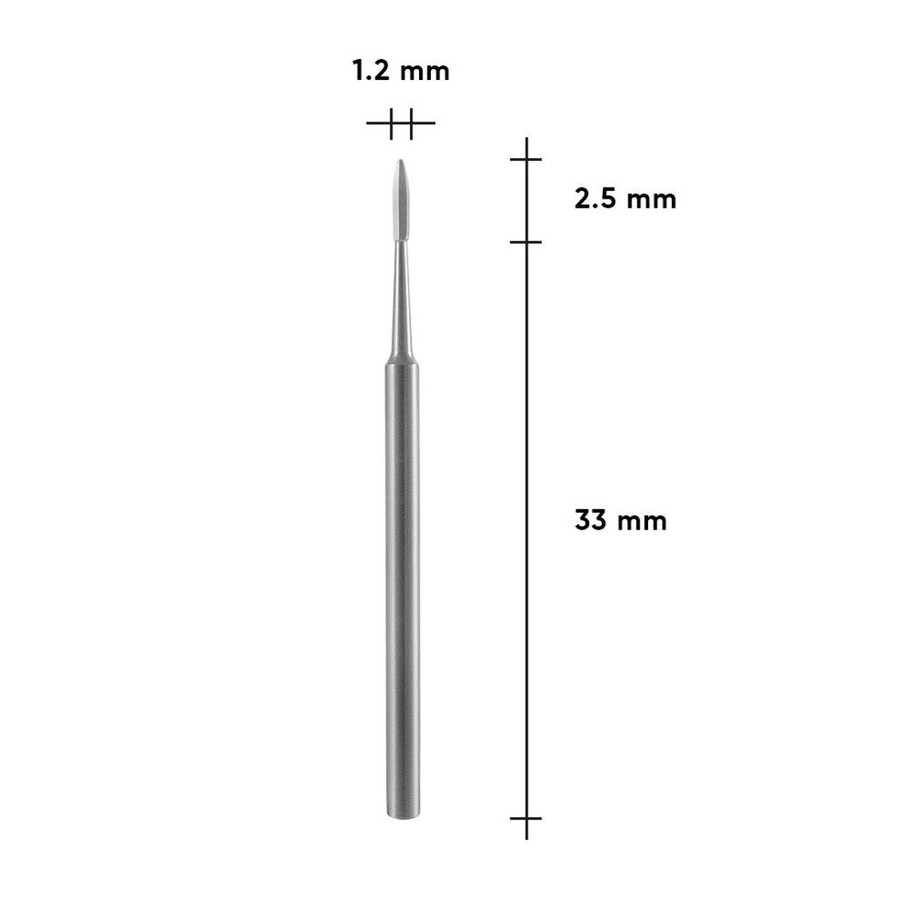 Діаметр хвостовика стандартний для фрезерного апарату — 2,35+0/-0,016 мм. Максимально допустиме значення швидкості обертання твердосплавної насадки – до 6000 об/хв. Важливо дотримуватись рекомендацій щодо кількості обертів для певного виду фрез та процедур, оскільки робота на підвищених обертах може викликати перегрів фрези та травмування клієнта.