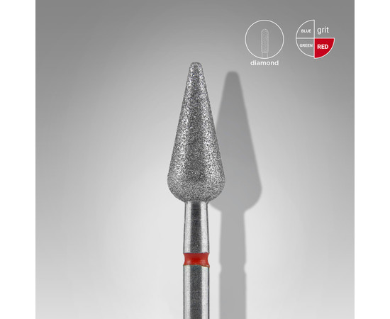 Staleks Pro алмазна насадка груша гостра насічка червона Red м'якої абразивності для апаратного манікюру та педикюру EXPERT 5 мм виготовляється напиленням алмазної крихти на металеву заготовку із нержавіючої сталі медичного класу. Наносяться алмазні зерна дрібної фракції: рівномірно і щільно покривають всю робочу область діаметром 5 мм, без прогалин та налипань в одному місці. Крихта на заготівлі закріплюється в результаті гальванічного процесу: тонкий шар нікелю утримує алмазні зерна, роблячи з'єднання міцним та довговічним.