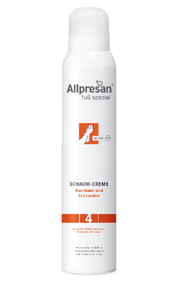 Allpresan крем-піна №4, призначена для догляду за шкірою стоп, схильною до утворення тріщин та підвищеної сухості. Загоює, інтенсивно пом'якшує, зволожує та регенерує ороговілі ділянки. Не має запаху, кольору та консервантів. Засіб протестований дерматологами.