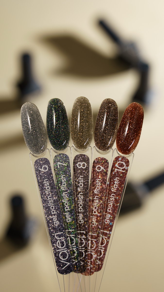 Світловідбиваючі гель - лаки VALERIщільні гель-лаки блискітки різних кольорів, що неймовірно сяють під променями сонця та при попаданні на них різного освітлення. Має чудову зносостійкість, зручний у нанесенні, а також самовирівнюються по нігтьовій пластині. Різноманітна палітра відтінків дозволить створити чудовий і неповторний манікюр. Гель-лак зі світловідбивним ефектом підійде як для святкового манікюру, так і у вигляді прикраси повсякденного покриття.