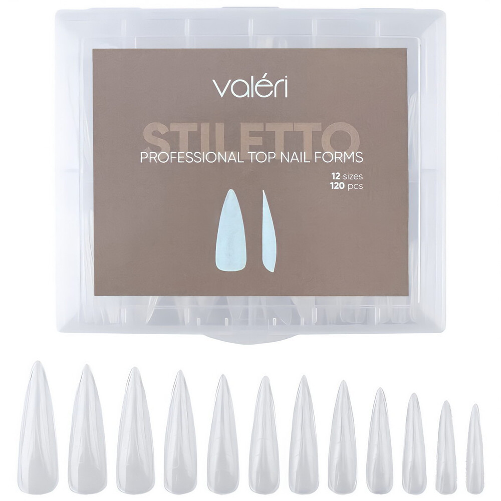 Valeri Professional Top Nail Forms "Stiletto"- зручний, раціональний та швидкий спосіб нарощування нігтів, який можна сміливо назвати досягненням нейл-індустрії. Специфіка фіксації тіпс дає довговічний результат, красиву, правильну форму нігтя. Форми для верхніх типів прості у використанні, їх нерідко рекомендують купувати майстрам-початківцям для відпрацювання навички.