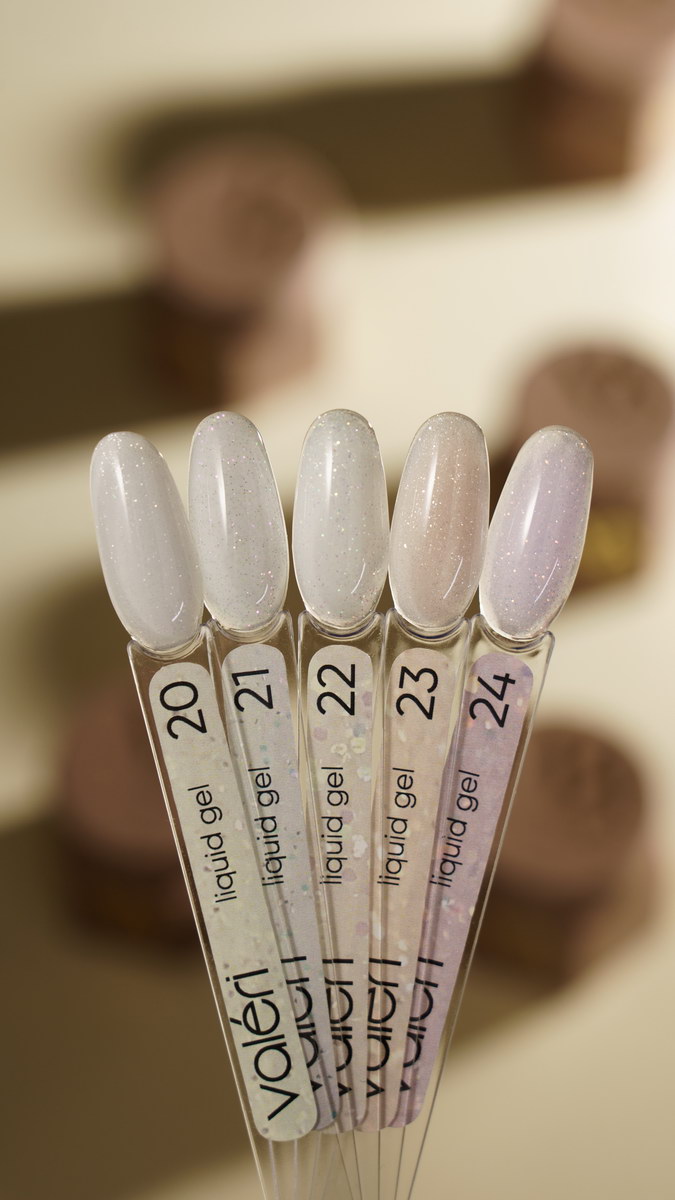 Valeri Liquid Gel Collection - це спеціальний гель, який використовується для створення міцного, глянцевого покриття на нігтях. Він має рідку консистенцію, що дозволяє легко наносити його на нігті, вирівнювати поверхню і створювати ідеальний манікюр. Ідеально підходить для зміцнення натуральних нігтів, а також для створення різних дизайнів та нарощування. Він відомий своєю еластичністю та здатністю зберігати блискучий вигляд тривалий час без сколів і тріщин.