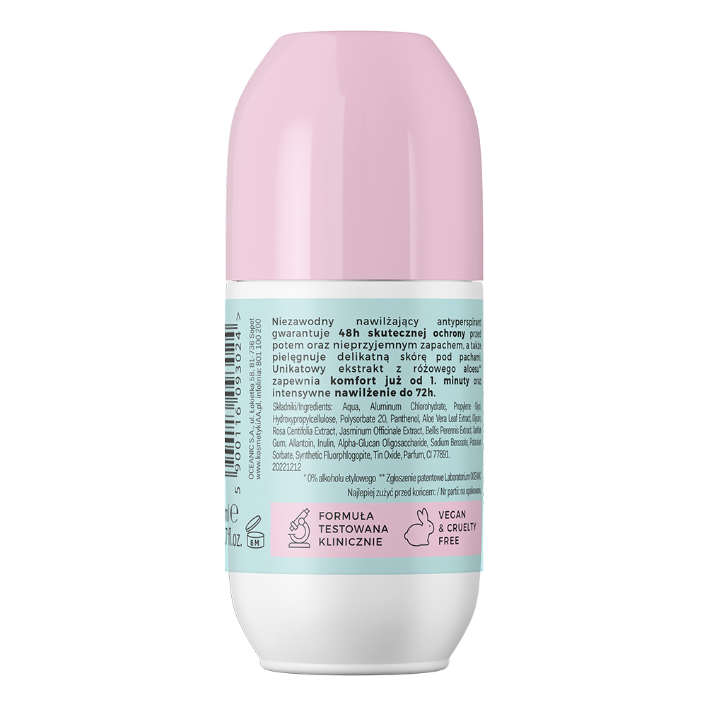 Антиперспірант кульковий AA ALOES Pink – комплексна програма зволоження для всіх типів шкіри, особливо для зневодненої та чутливої шкіри, яка потребує заспокоєння та регенерації. Надійний зволожуючий антиперспірант гарантує 48 годин ефективного захисту від поту та неприємного запаху, а також піклується про ніжну шкіру під пахвами. Унікальний екстракт рожевого алое у складі забезпечує комфорт з першої хвилини та інтенсивне зволоження до 72 годин.