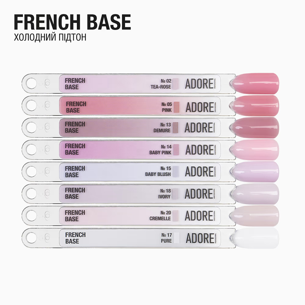 Висновки: Камуфлююча база Адор Френч добре маскує нерівності та недоліки нігтьової пластини, створюючи природну основу під французький або “clean” манікюр.