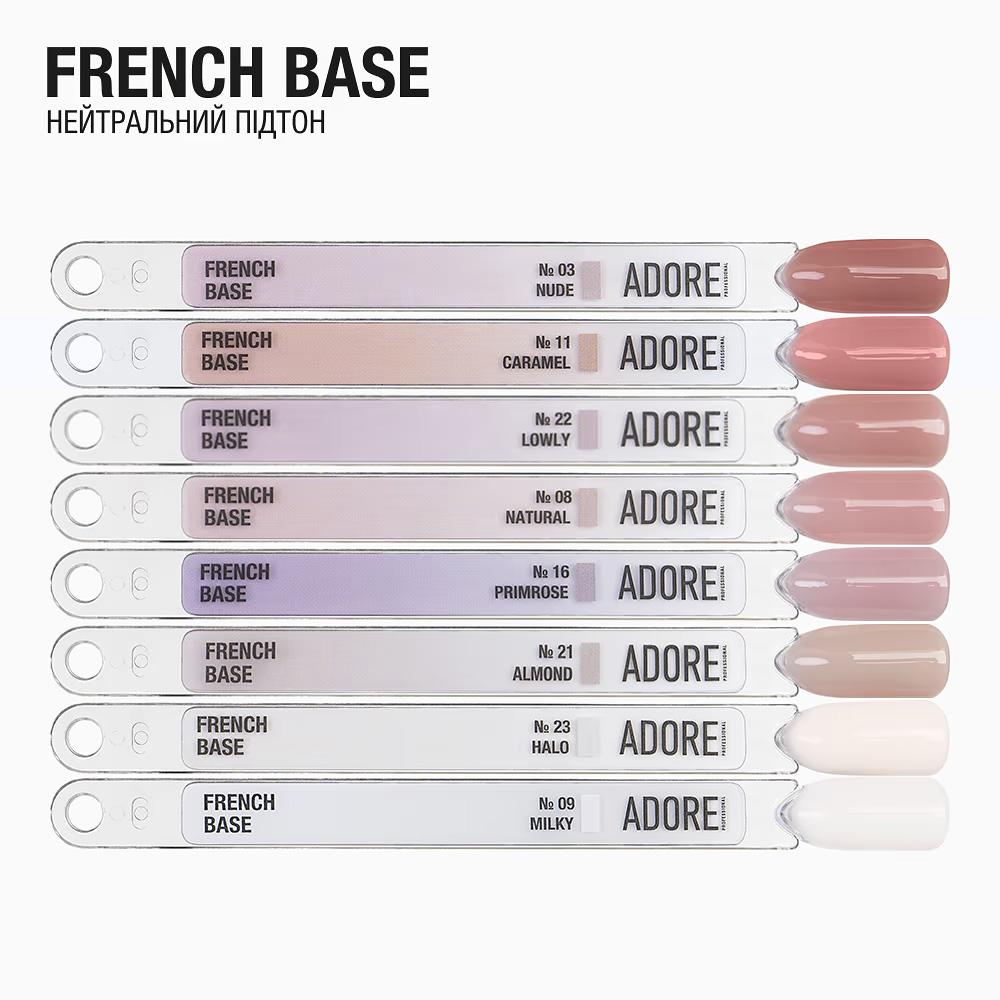 Нейл-майстрам варто купити камуфляжну базу для нігтів Adore French Base pure разом із Multi Slim Base, щоб подовжити термін носіння нюдового покриття.