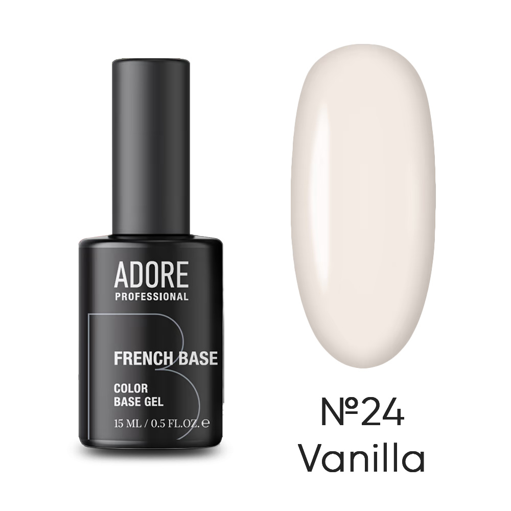 Adore Professional Камуфлююча база French Base vanilla належить до групи теплих тонів і поєднується з теплим підтоном шкіри, коли судини на зап’ясті виглядають зелено-блакитними або оливковими. Ванільний колір візуально вирівнює тон нігтьової пластини, роблячи руки акуратними та доглянутими. Тонувальний матеріал входить до колекції, в якій зібрано 25 нюдових відтінків для створення френча або манікюру з ефектом “clean look”.