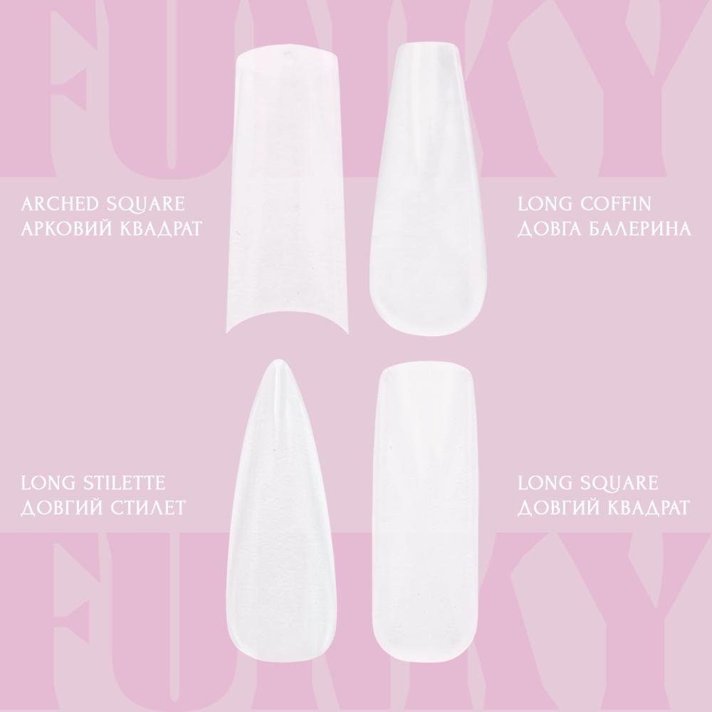 Одноразові тіпси на гелевій основі для швидкісного нарощення нігтів - мікс формГелеві тіпси - це справжня революція у світі моделювання нігтів. Унікальний продукт здатен замінити майстрам форми для нарощення, гель чи акрил-гель, значно спростити і скоротити процес нарощення до 20-30хвилин!FUNKY GEL NAIL TIPS - тонкі, але міцні та гнучкі тіпси на основі моделируючого гелю та пластику. Добре витримують повсякденні навантаження, гарно амортизують та зовнішньо майже не відрізняються від натуральних нігтів. Вироблені по SOAK OFF формулі, підходять для знімання як розмочуванням за допомогою GEL REMOVER, так і фрезою. Тіпси легко опилювати та змінювати довжину.Найкраще підходять для випадків, коли потрібно зберегти природню архітектуру нігтьової пластини. Підходить для клієнтів, що гризуть нігті.FUNKY GEL NAIL TIPS - MIX містять по 3 пластини форм подовжена балерина, подовжений стілет, подовжений квадрат та 1 пластину форми екстра-довгий квадрат із С-подібним вирізом від 0 до 11 розміру в коробці, що дозволяє обрати найкращу форму та розмір для кожного нігтя.Переваги:Висока швидкість нарощення· нарощення одного нігтя займає 1-2 хвилини· нарощені тіпси можна одразу покривати кольоромНизька собівартість· вартість одного нарощення складатиме не більше 1$Простота в роботі· не вимагають навиків моделювання· мінімум додаткових матеріалів· не потребують корегування архутектуриМінімальне опилювання· ідеально гладка структура· мінімальна товщина в зоні кутикули для щільного прилягання до нігтьової пластини · гарна архітектура, подібна до натурального нігтяЛегкість· нігті, нарощені на гелеві тіпси, невагоміНедоліки:· вимагають припасування форми або додаткової роботи з натуральним нігтем для деяких типів і розмірів нігтів (аркові, трампліни)Технологія використання:1. Знежирити нігтьову пластину механічно (за допомогою бафа) і хімічно (за допомогою PREP&FINISH та безворсової серветки)2. Нанести дегідратор NAIL FRESHER на весь ніготь, дати підсохнути на повітрі. Якщо нігті не набули білуватого відтінку - повторити дегідрацію3. Нанести безкислотний праймер ULTRABOND* напівсухим пензлем на вільний край нігтьової пластини* в разі використання високоадгезивної MULTI BASE цей крок можна пропустити4. Нанести гнучке базове покриття MULTI BASE або клей-гель FUNKY TIPS GLUE GEL на весь натуральний ніготь. Полімеризувати в UV-лампі 2-3 хвилини, в LED-лампі - 60 секунд5. Підібрати необхідний розмір та форму FUNKY GEL NAIL TIPS для кожного нігтя6. Нанести MULTI BASE/ FUNKY TIPS GLUE GEL із внутрішної сторони тіпси на контактну зону тіпси з натуральним нігтем тонким шаром7. Притиснути тіпсу до нігтьової пластини, поступово підштовхнути до кутикули. Залишити відступ в 1-2мм, відправити ніготь в лампу на кілька секунд, щоб схопився клей. Можна використовувати міні-лампу чи лампу-ліхтарик для зручнішої фіксації8. Досушити нігті в UV-лампі 2-3 хвилини, в LED-лампі - 60 секунд без притискання9. Прибрати сходинку в зоні кутикули фрезою або пилкою, зафіксувати зріз базою. Полімеризувати вирівнюючий шар в UV-лампі 2-3 хвилини, в LED-лампі - 60 секунд10. Придати нігтю форму пилкою з абразивністю не більше 180 грит11. Нанести кольорове покриття та зафіксувати його топом, або скористатись кольоровим топом FUNKY COLOR TOP. Рекомендуємо внутрішню сторону вільного краю типси так само покривати топом, щоб уникнути її помутніння в процесі носіння.