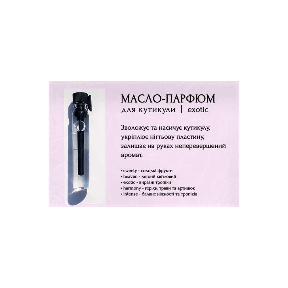 Олія-парфюм для кутикули 2мл – exoticПарфумована олія для кутикули EXOTIC збереже свіжість манікюру і додасть зачаруучого яскравого аромату соковитих тропічних фруктів вашим рукам. Масло зволожує і живить кутикулу, створює захисний бар'єр на шкірі, швидко вбирається, залишаючи тільки приємний запах парфумів. Можна використовувати для ароматизації SPA-процедур. Гіпоалергенно.Технология нанесения:на чисту шкіру навколо нігтів піпеткою нанесіть невелику кількість масла і м'якими масажними рухами втирайте подушечками пальців. Рекомендуємо використовувати відразу після манікюру і щодня після миття рук.