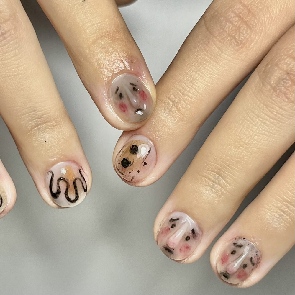 5. Колір: нанести Tint Base рівномірним шаром, ретельно пропрацювати зони бокових валиків. Додати невелику краплю та зробити мінімальне вирівнювання нігтьової пластини (до 1 мм). Полімеризувати в LED-лампі - 60 секунд