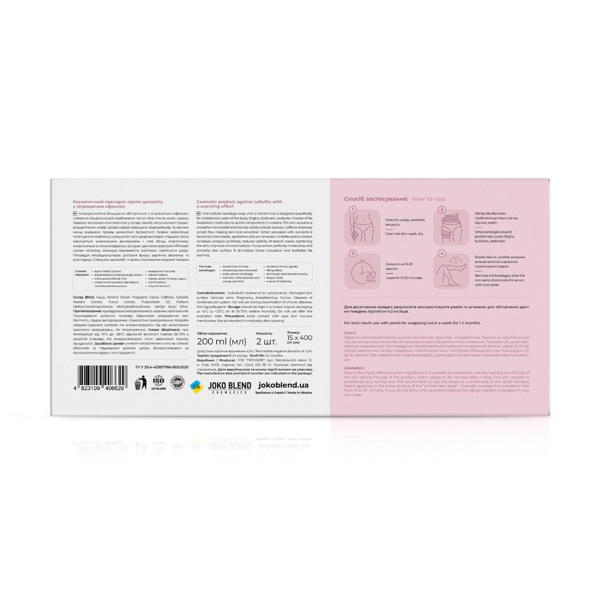 Антицелюлітне бандажне обгортання з зігріваючим ефектом Joko Blend™ ефективно бореться з розтяжками та целюлітом на різних стадіях, має яскраво виражений лімфодренажний ефект і активно сприяє зменшенню небажаних об'ємів та формуванню стрункої фігури. Обгортання проникає у глибокі шари шкіри та впливає на жирові клітини зсередини. Засіб не тільки розщеплює жирові відкладення, а й помітно підтягує шкіру навіть на самих проблемних місцях, роблячи її пружною та еластичною. Склад обгортання збагачений активними натуральними компонентами, які дозволяють вирішити проблему із зайвими об'ємами на клітинному рівні. Кофеїн забезпечує поліпшення лімфотоку, прискорює обмінні процеси в клітинах, зменшує втрату вологи. В результаті чого шкіра виглядає гладшою, насичується живильними речовинами та стає більш еластичною, оновлюються клітини епідермісу.