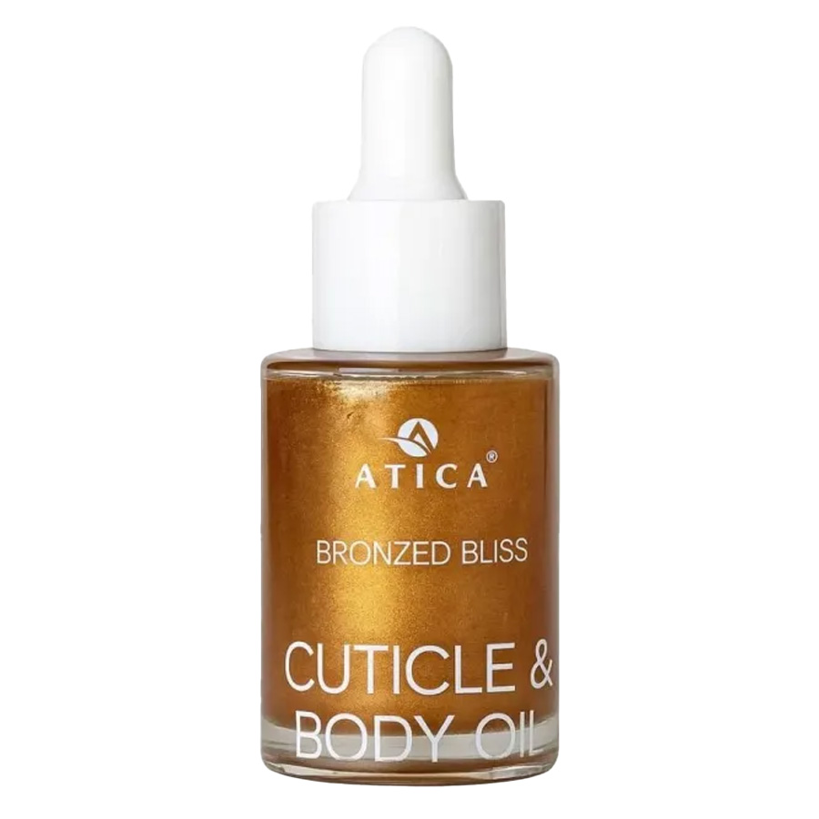 Подаруйте собі момент розкоші з олійкою Bronzed Bliss від ATICA. Шимерна олія з витонченим бронзовим сяйвом ідеально підходить як для догляду за кутикулою, так і для тіла.