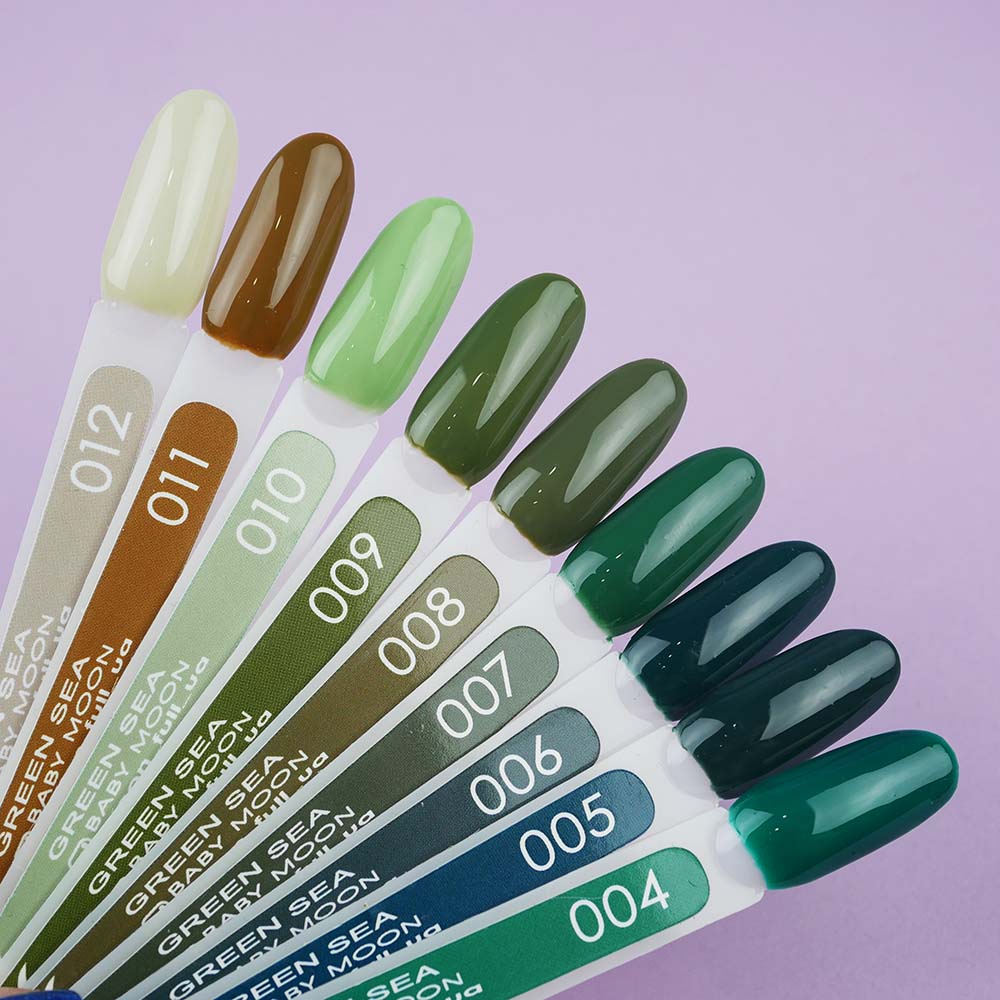 Baby Moon Green Sea - всі відтінки зеленого в одній колекції гель-лаків! Смарагд і м'ята, хвоя і оливка... Поринь у море свіжості!
