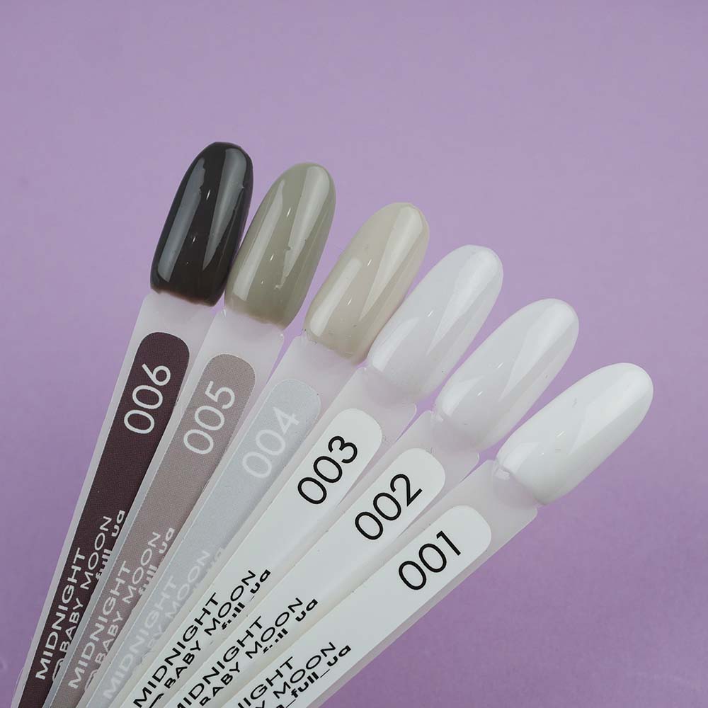 Baby Moon Midnight - назва цієї колекції гель-лаків перекладається як опівночі. Лаконічна чорно-біло-сіра кольорова гама дарує відчуття непорушності та сталості. Стильна інтерпретація класичних рішень!
