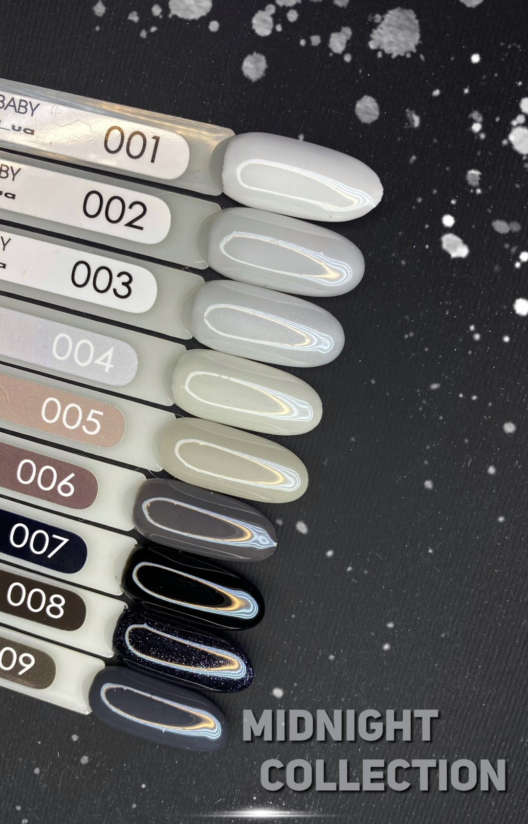 Baby Moon Midnight - назва цієї колекції гель-лаків перекладається як опівночі. Лаконічна чорно-біло-сіра кольорова гама дарує відчуття непорушності та сталості. Стильна інтерпретація класичних рішень!