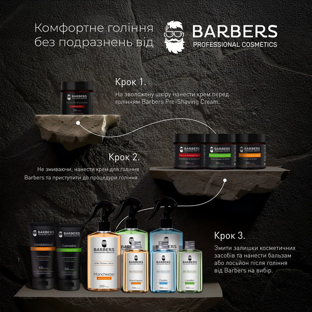 Бальзам після гоління з олією сандалового дерева Barbers Sandalwood допомагає підтримувати здоровий стан шкіри обличчя та забезпечує комфортне гоління без подразнень. Олія сандалового дерева, що входить до складу бальзаму, сприяє заспокоєнню шкіри та зменшенню подразненнь, здатна усувати почервоніння, свербіж та запалення, що робить засіб ідеальним рішенням для чутливої шкіри. Сік алое вера сприяє зміцненню та відновленню шкіри, покращує її текстуру шляхом делікатної ексфоліації ороговілих клітин та забезпечує антизапальний ефект. Використання бальзаму після гоління гарантує ефективність, безпеку та комфорт.