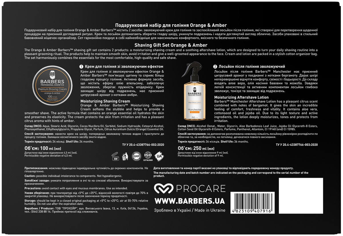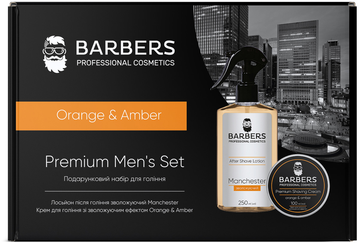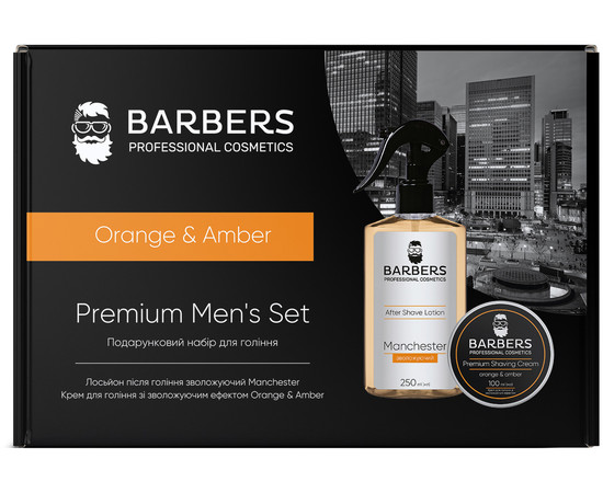 Подарунковий набір для гоління Orange & Amber Barbers™ містить 2 засоби: зволожуючий крем для гоління та заспокійливий лосьйон після гоління, які створені для перетворення щоденної процедури на приємний доглядовий ритуал. Крем та лосьон допомагають зберегти гладку шкіру, уникнути подразнень і надати доглянутий вигляд обличчю. Засоби упаковані в стильний бавовняний мішечок-органайзер. Сет гармонійно поєднує в собі найнеобхідніше для максимально комфортного, якісного та безпечного гоління.
