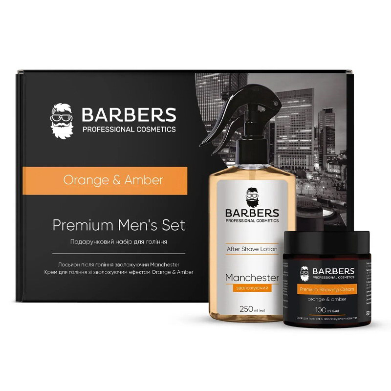 Подарунковий набір для гоління Barbers Orange & Amber Крем для гоління зі зволожуючим ефектом 100 мл + Зволожуючий лосьйон після гоління 250 мл
