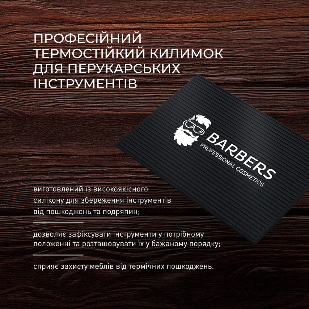 Професійний термостійкий килимок для перукарських інструментів Barbers виготовлений із високоякісного силікону для збереження інструментів майстра від пошкоджень та подряпин.