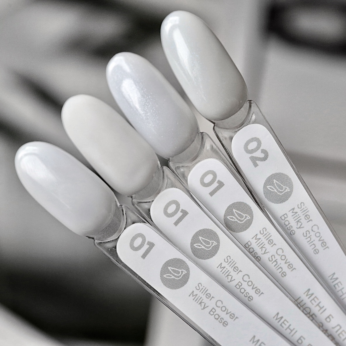 Siller Cover Base Milky Shine №1 молочна камуфлююча база c сріблястим блиском для нігтів, 15 мл