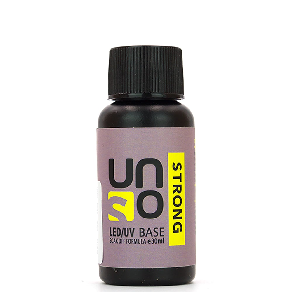 UNO Strong Base є високоякісним покриттям на каучуковій основі. Завдяки своїй консистенції матеріал наноситься легко і зручно, самовирівнюється по нігтьовій пластині. Має прозорий колір. З UNO манікюр буде зберігатися без сколів і тріщин до 4х тижнів. Базу можна використовувати досить часто, при цьому не завдаючи шкоди натуральним нігтям.