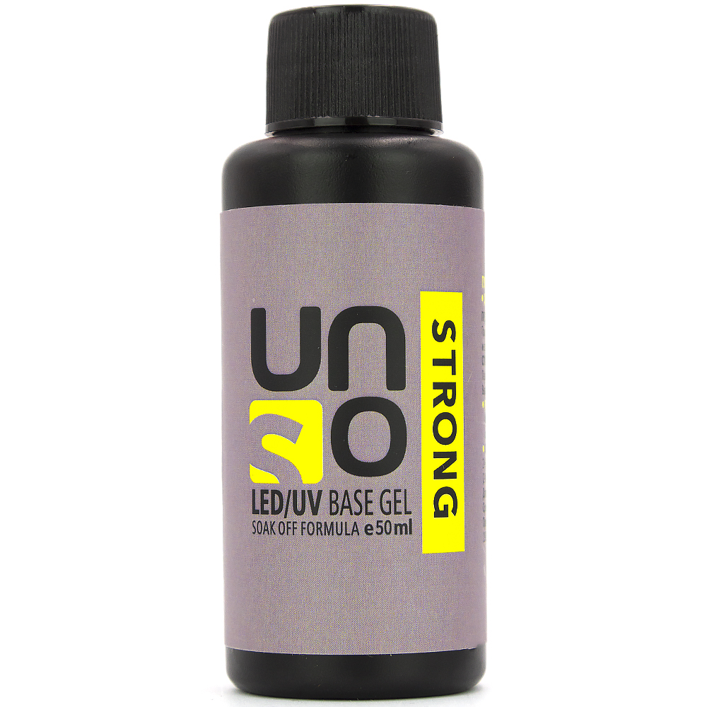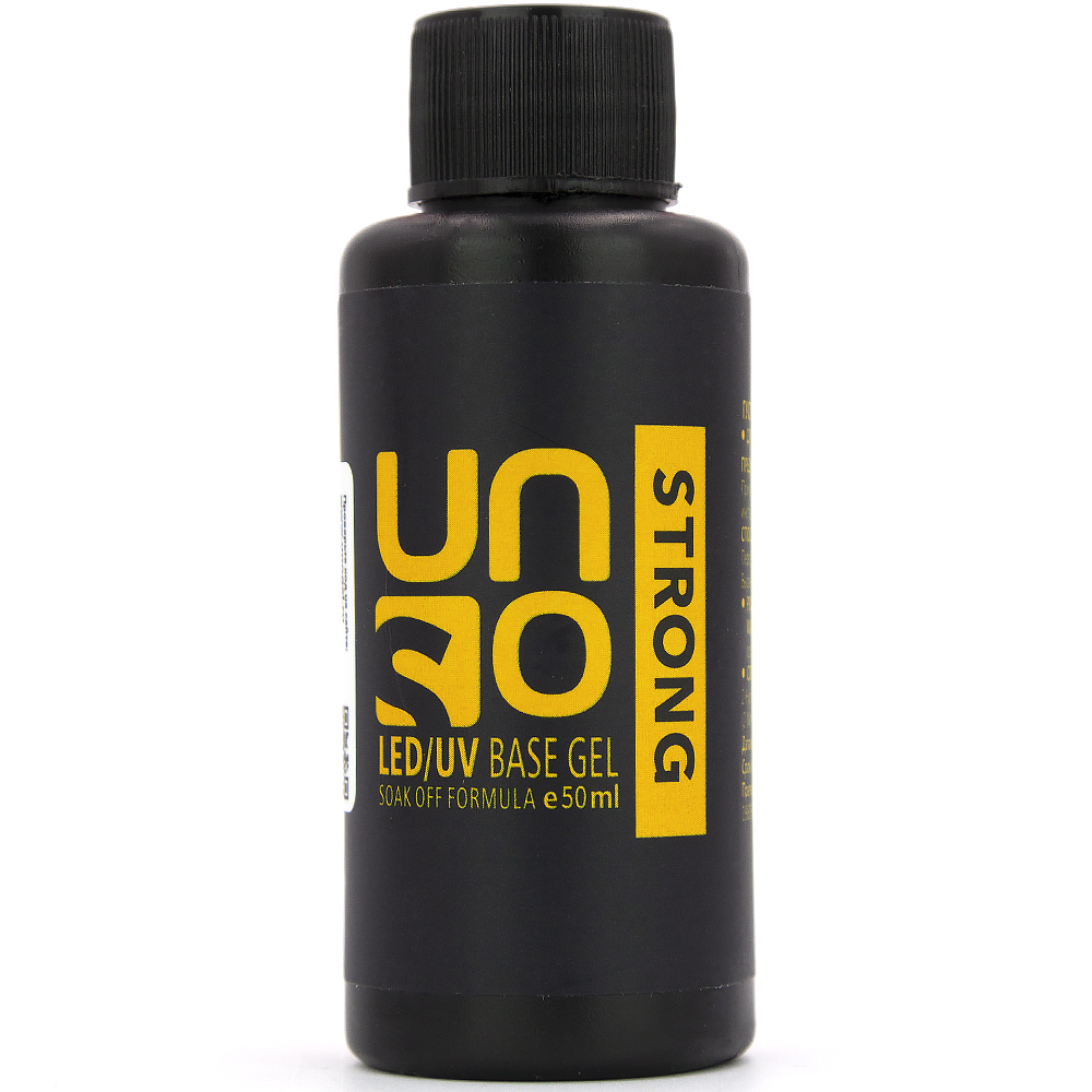 UNO Strong Base є високоякісним покриттям на каучуковій основі. Завдяки своїй консистенції матеріал наноситься легко і зручно, самовирівнюється по нігтьовій пластині. Має прозорий колір. З UNO манікюр буде зберігатися без сколів і тріщин до 4х тижнів. Базу можна використовувати досить часто, при цьому не завдаючи шкоди натуральним нігтям.