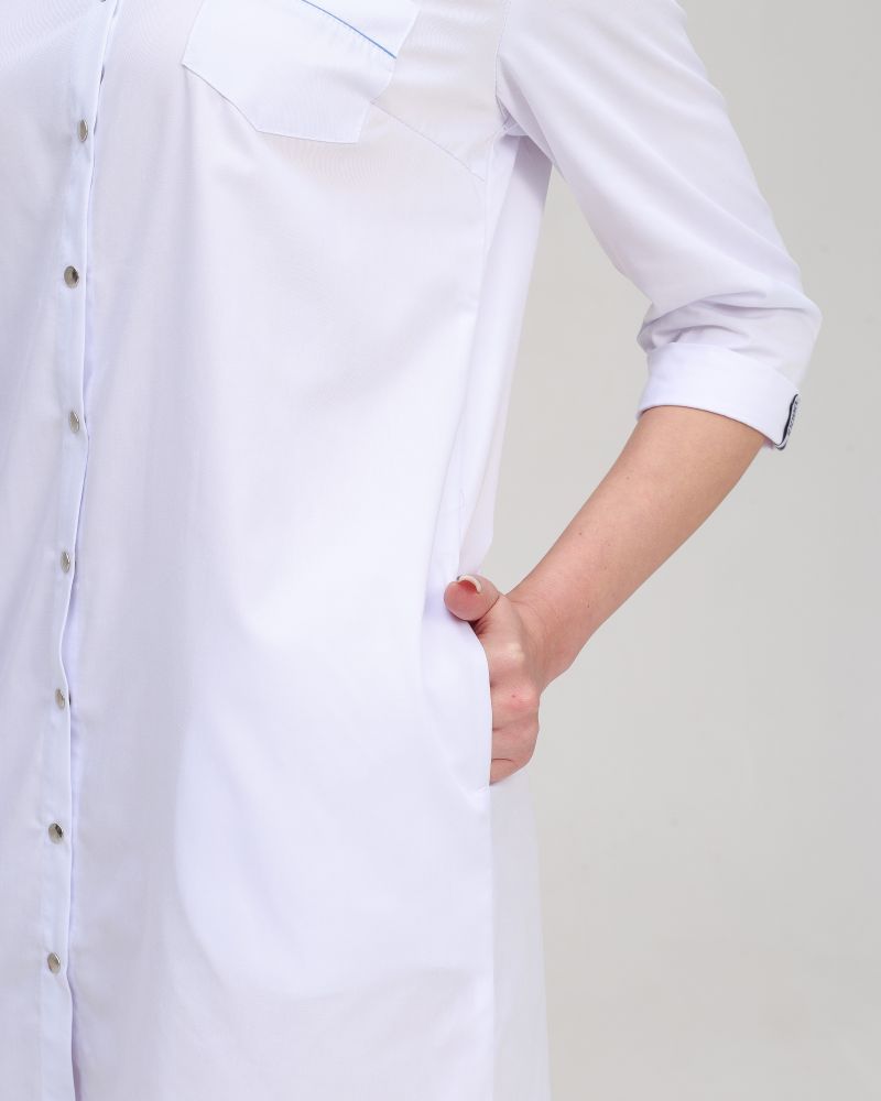 Є три кишені – одна нагрудна і дві бічні, щоб усе потрібне мати при собі. Халат застібається на низку кнопок. Комір жіночого халата стояче-відкладної, стійка зсередини оброблена контрастною тканиною. Рукав четвертий, одношовний, вшитий, з манжетом.