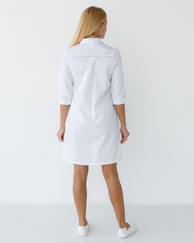 А-силует медичного жіночого халату забезпечує комфорт протягом дня. Спинка виробу декорована кокеткою з кантом із тканини контрастного кольору.