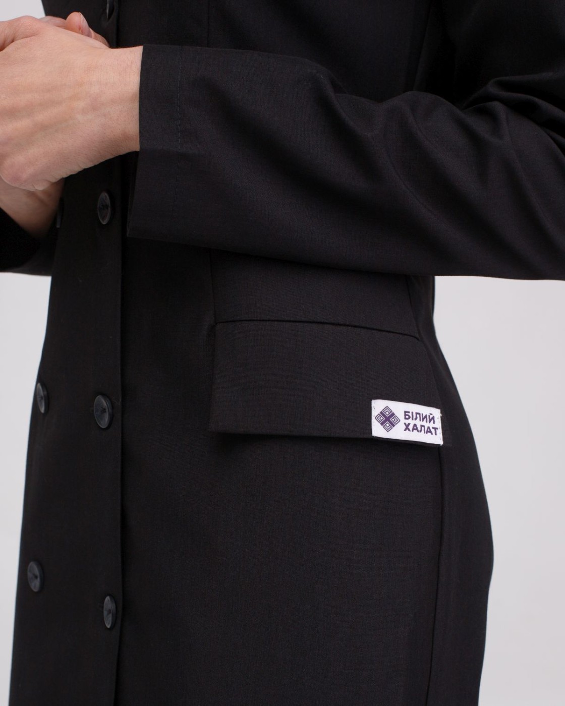 Елегантний медичний халат піджачного фасону. Лаконічна довжина, два ряди брендованих гудзиків і відкладний класичний комір (англійський) роблять такий халат ідеальною уніформою не тільки для лікарів-практиків, а й б'юті-майстрів, викладачів медичних закладів.