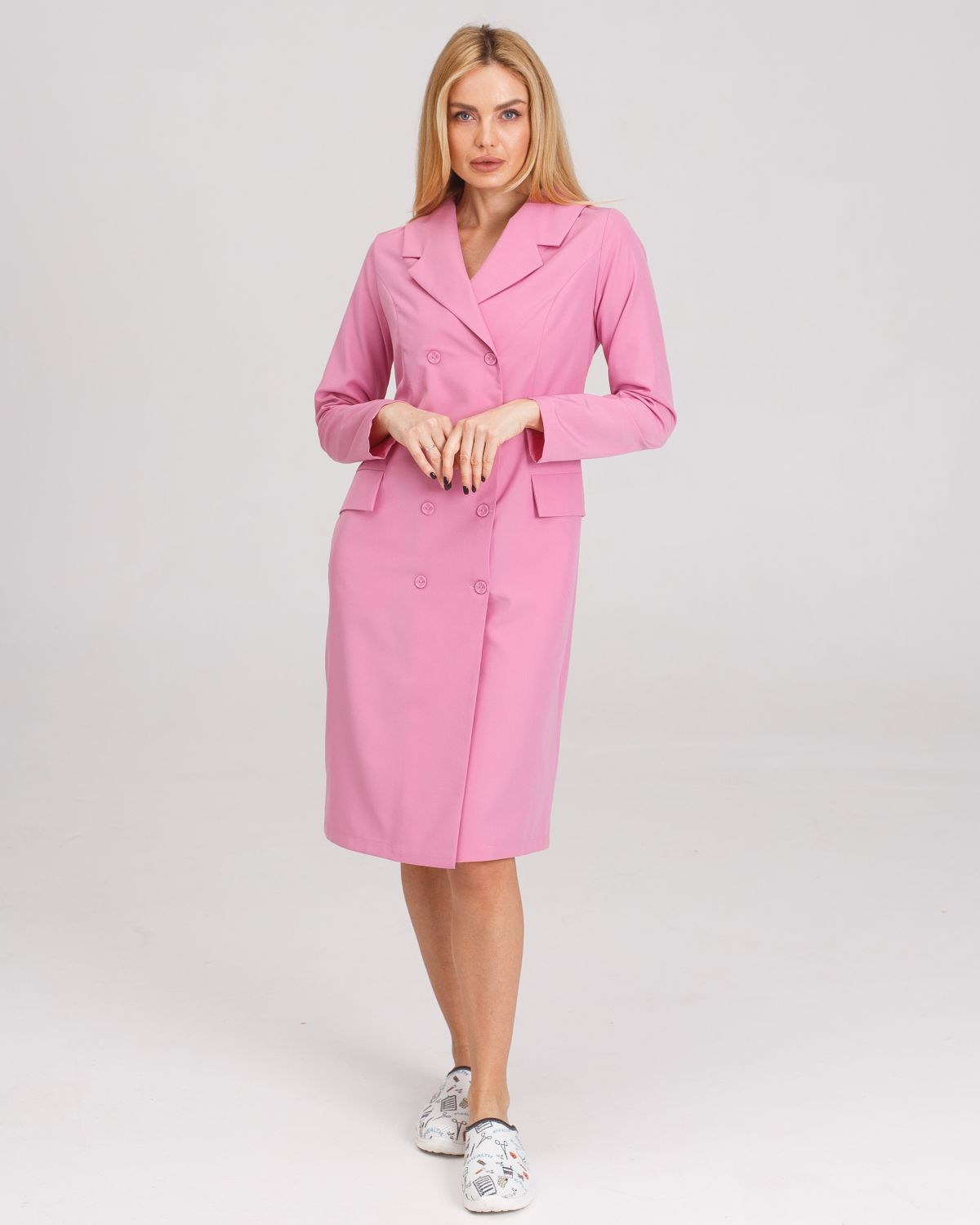 Елегантний медичний халат піджачного фасону. Лаконічна довжина, два ряди брендованих ґудзиків та відкладний класичний комір (англійський) роблять такий халат ідеальною уніформою не тільки для лікарів-практиків, а й б'юті-майстрів, викладачів медичних закладів.