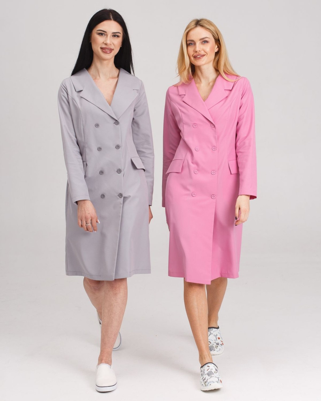 Елегантний медичний халат піджачного фасону. Лаконічна довжина, два ряди брендованих гудзиків і відкладний класичний комір (англійський) роблять такий халат ідеальною уніформою не тільки для лікарів-практиків, а й б'юті-майстрів, викладачів медичних закладів.