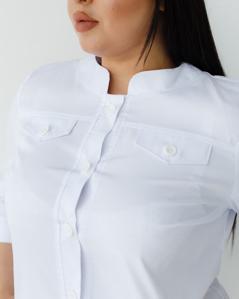 Жіночий халат Валері +SIZE має прямий фасон, рукави не обмежують рухів. Халат жіночий для медиків Валері +SIZE застібається на ряд ґудзиків, глибину декольте та висоту розрізу ви зможете регулювати самостійно. На лицьовій стороні халата жіночого медичного Валері +SIZE розташувалися дві місткі кишені, на грудях декоративні кишені-обманки, доповнені брендованими гудзиками. Комір стійка і напівприталений фасон візуально витягують силует, роблячи його витонченішим, з акцентованою лінією талії.