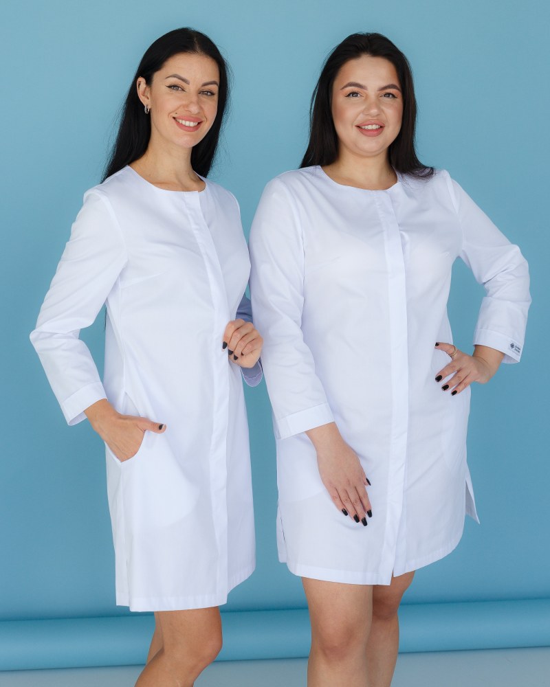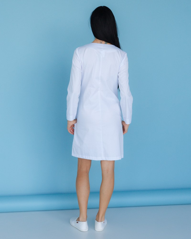 Напівприталений халат довжиною до колін. Практична довжина рукава 7/8, лівий рукав декорований брендованою нашивкою. Халат застібається на ряд потаємних гудзиків, виріз горловини - у формі напівчовника. Є 2 кишені.