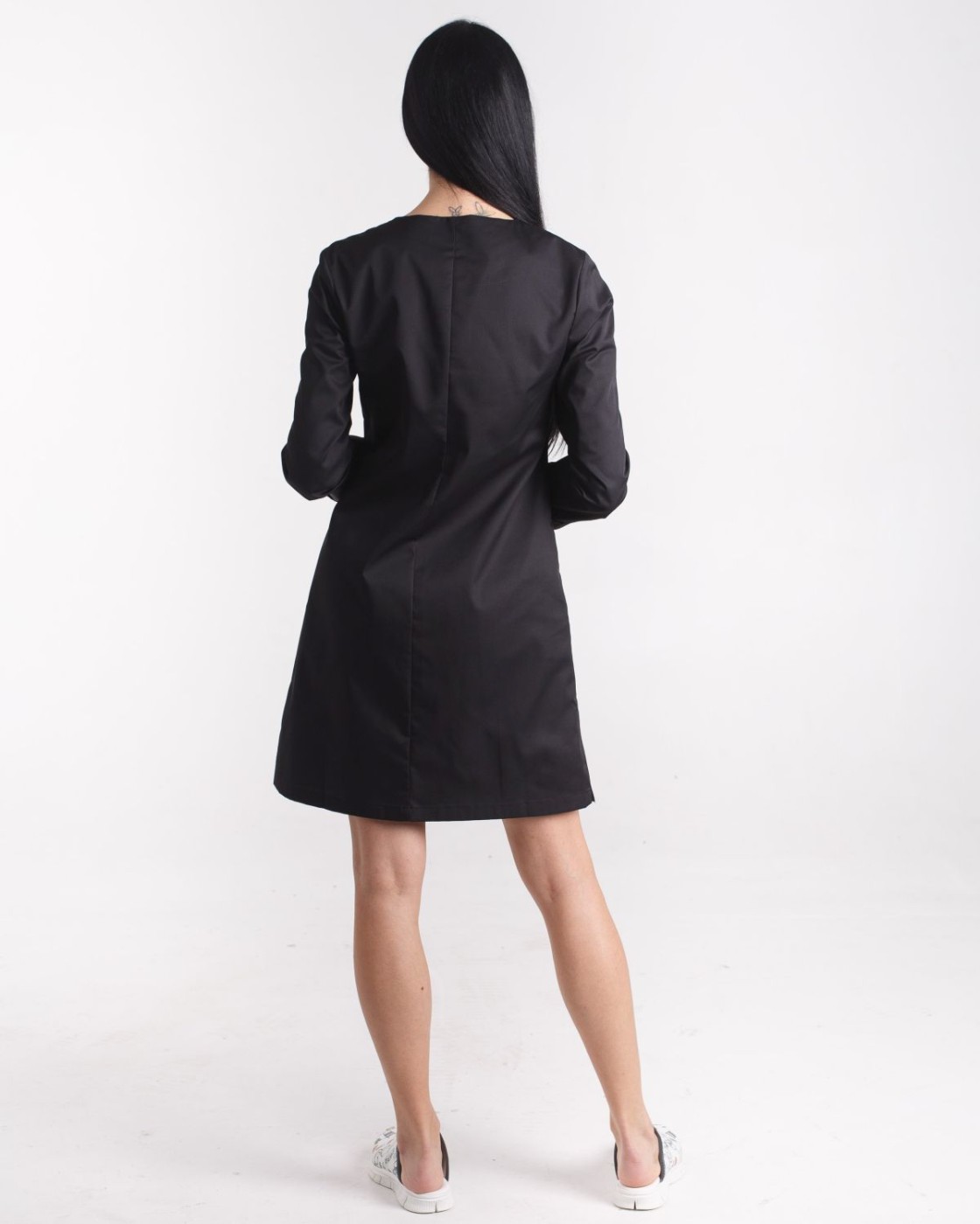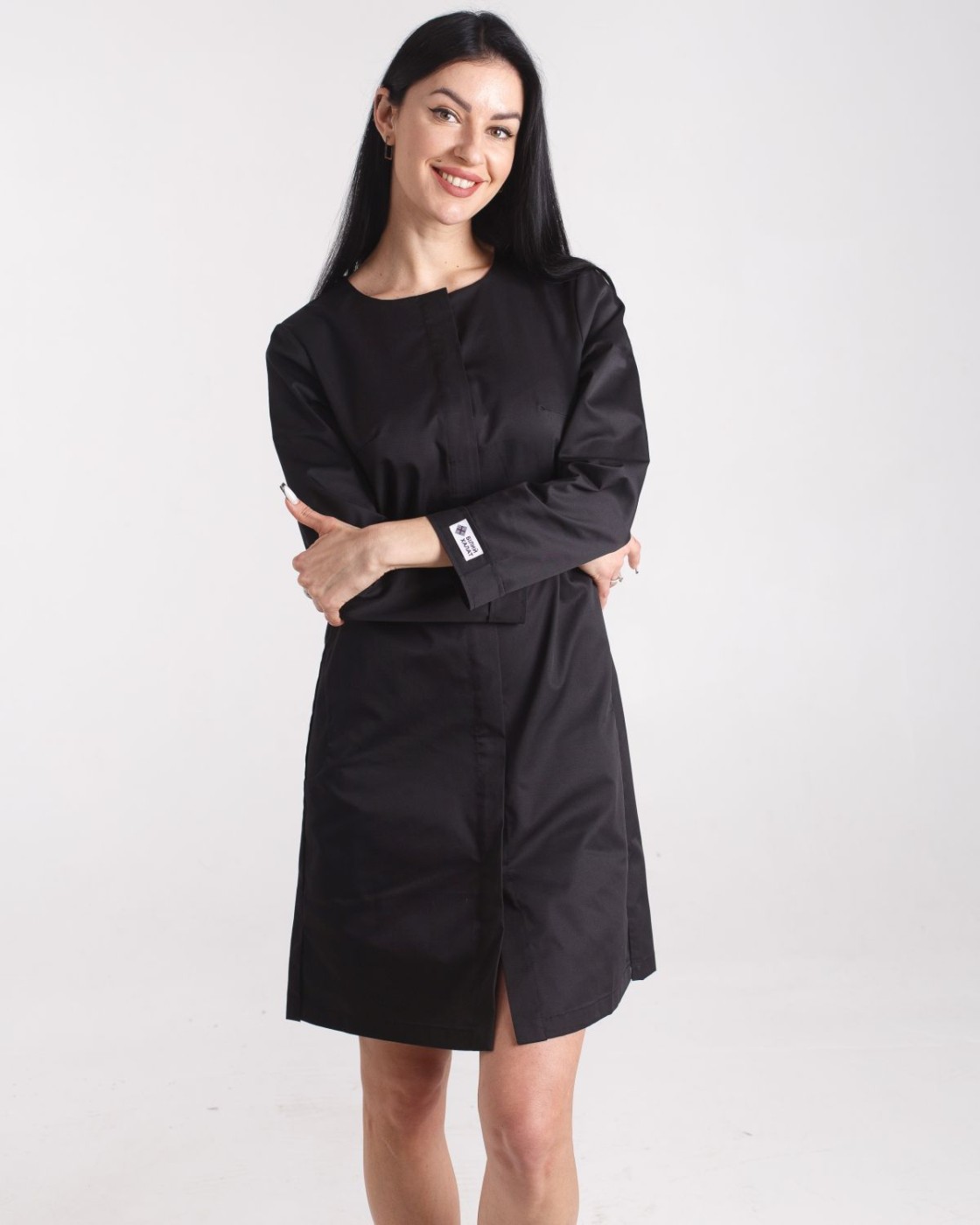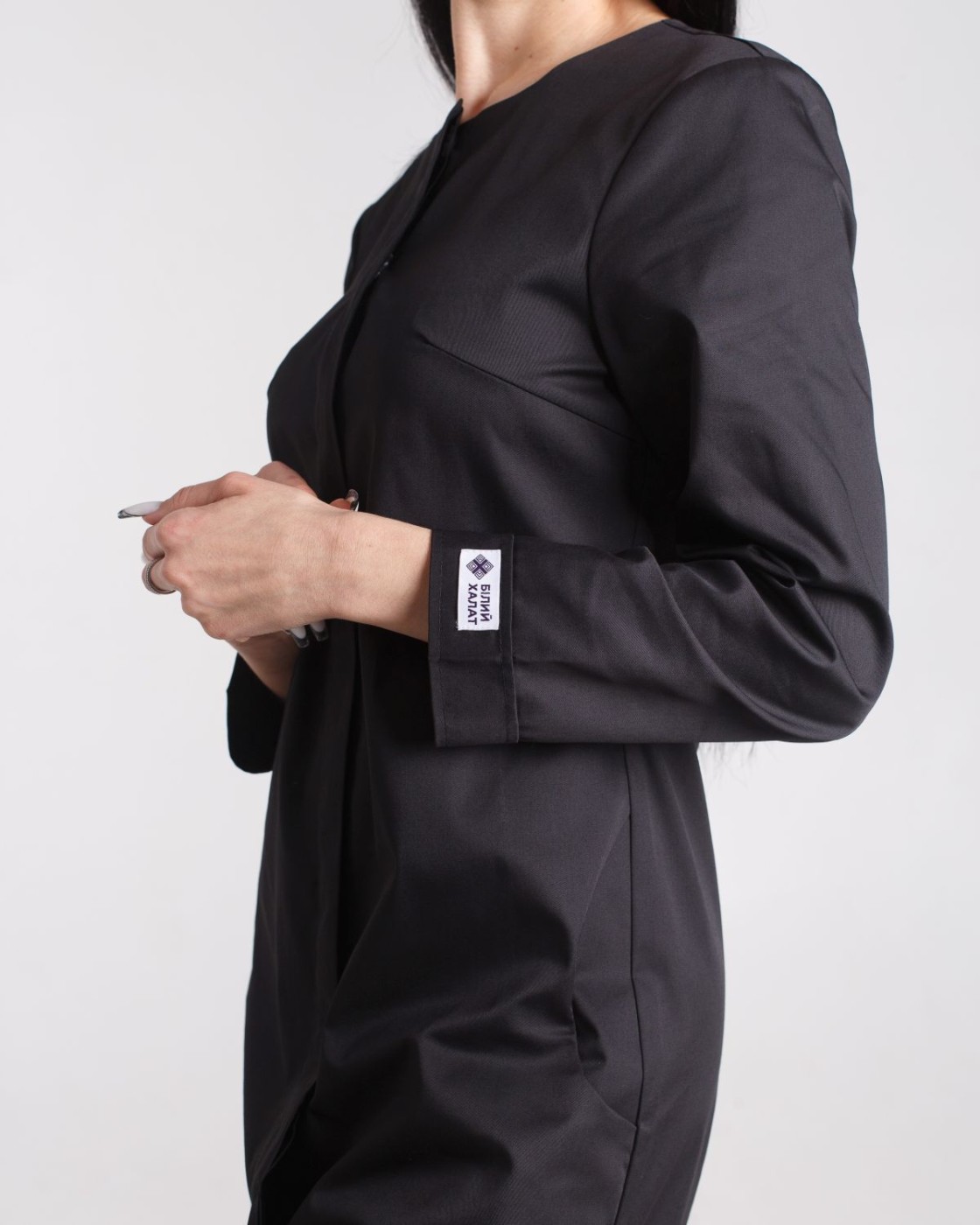 Напівприталений халат довжиною до колін. Практична довжина рукава 7/8, лівий рукав декорований брендованою нашивкою. Халат застібається на ряд потаємних гудзиків, виріз горловини - у формі напівчовника. Є 2 кишені.