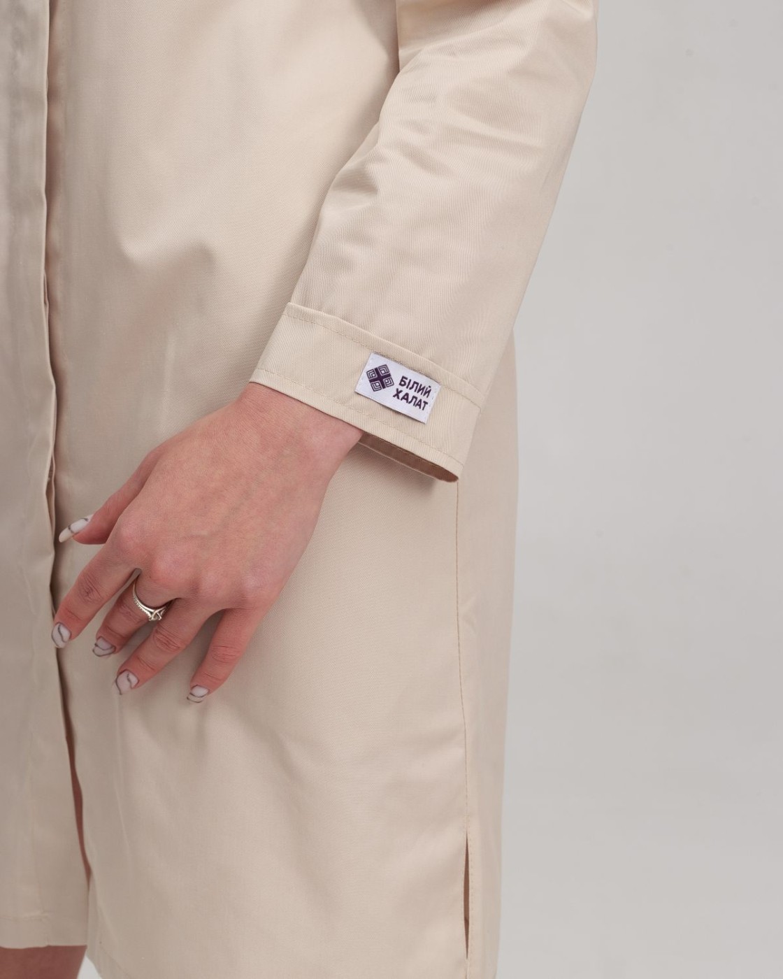 Напівприталений халат довжиною до колін. Практична довжина рукава 7/8, лівий рукав декорований брендованою нашивкою. Халат застібається на ряд потаємних гудзиків, виріз горловини - у формі напівчовника. Є 2 кишені.