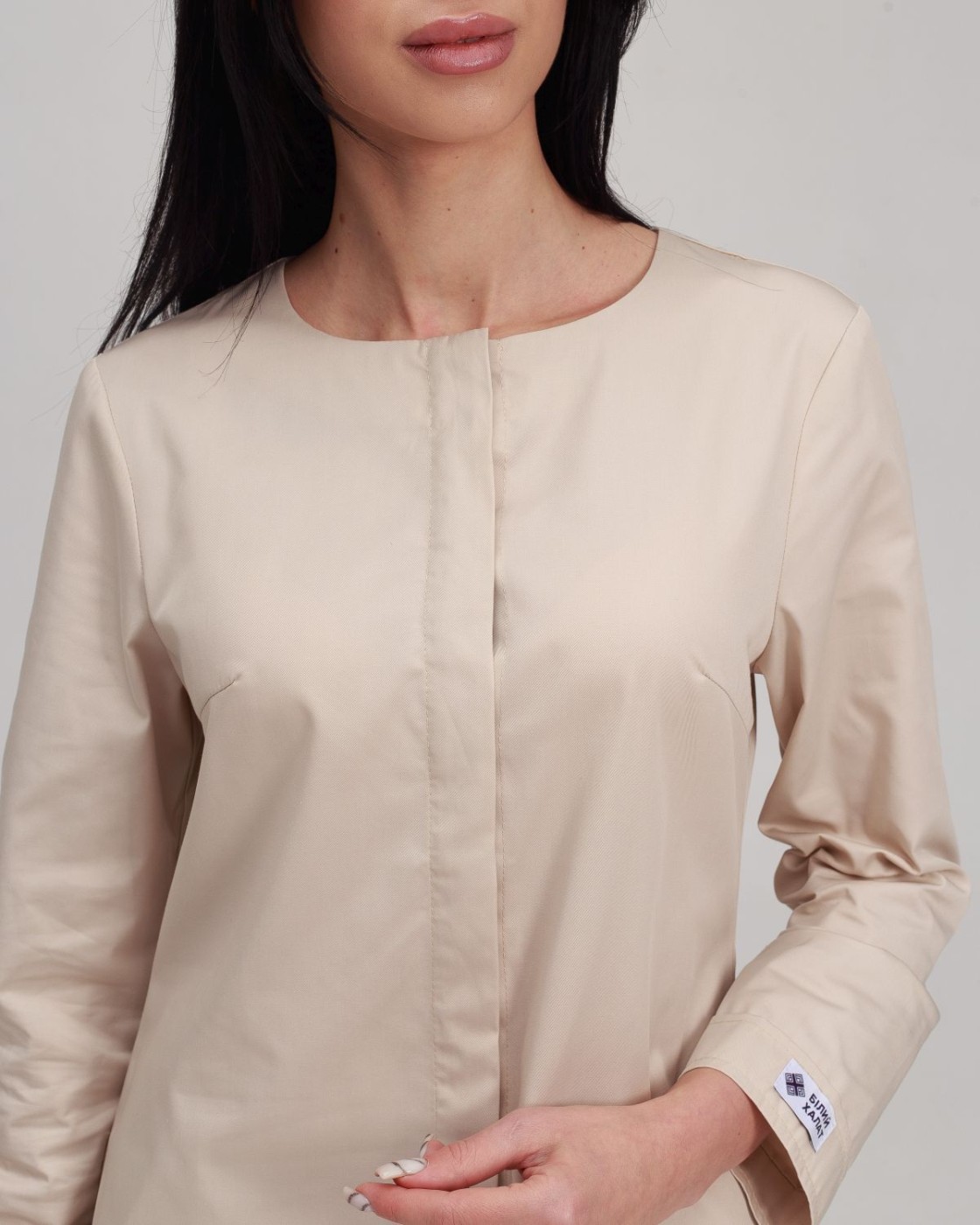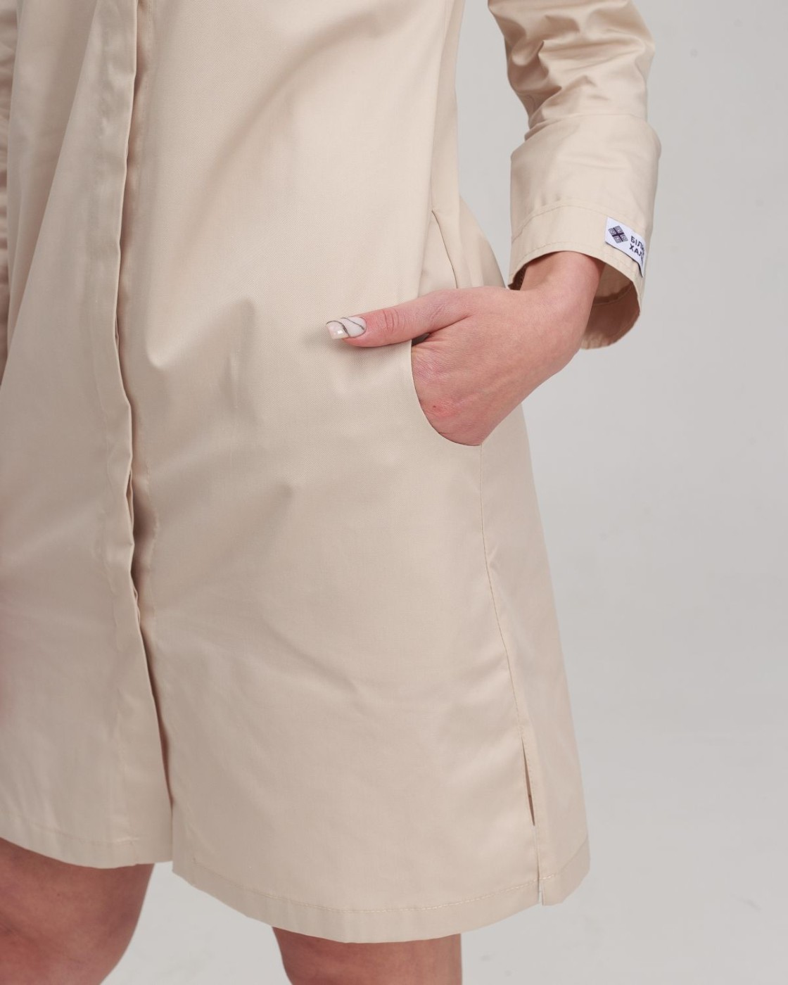 Напівприталений халат довжиною до колін. Практична довжина рукава 7/8, лівий рукав декорований брендованою нашивкою. Халат застібається на ряд потаємних гудзиків, виріз горловини - у формі напівчовника. Є 2 кишені.