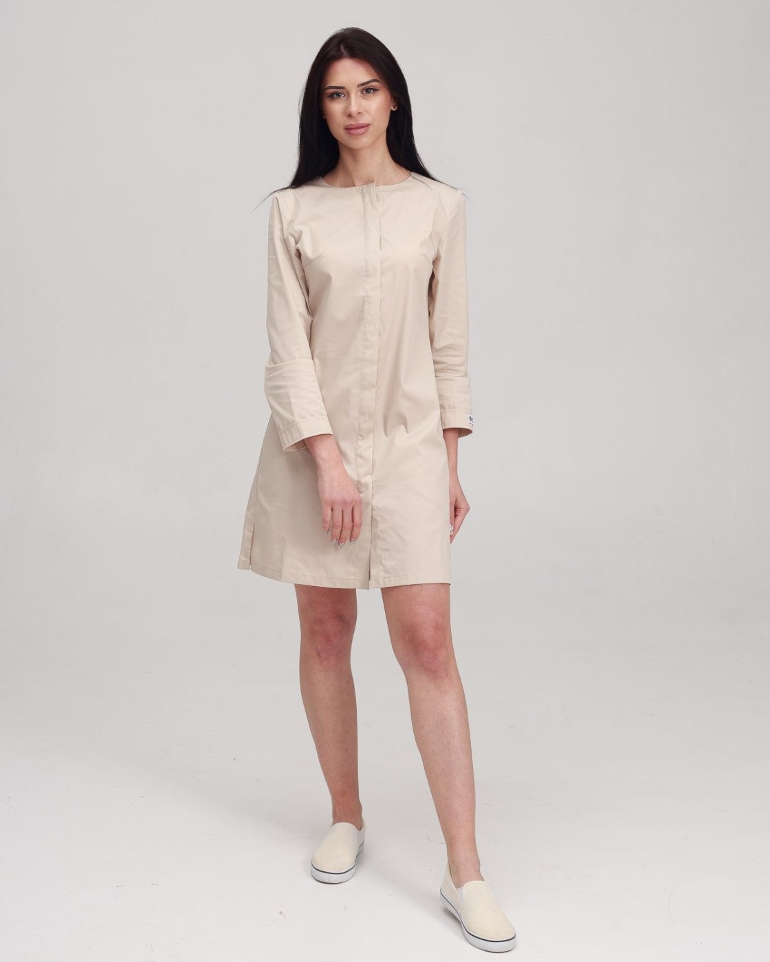 Напівприталений халат довжиною до колін. Практична довжина рукава 7/8, лівий рукав декорований брендованою нашивкою. Халат застібається на ряд потаємних гудзиків, виріз горловини - у формі напівчовника. Є 2 кишені.