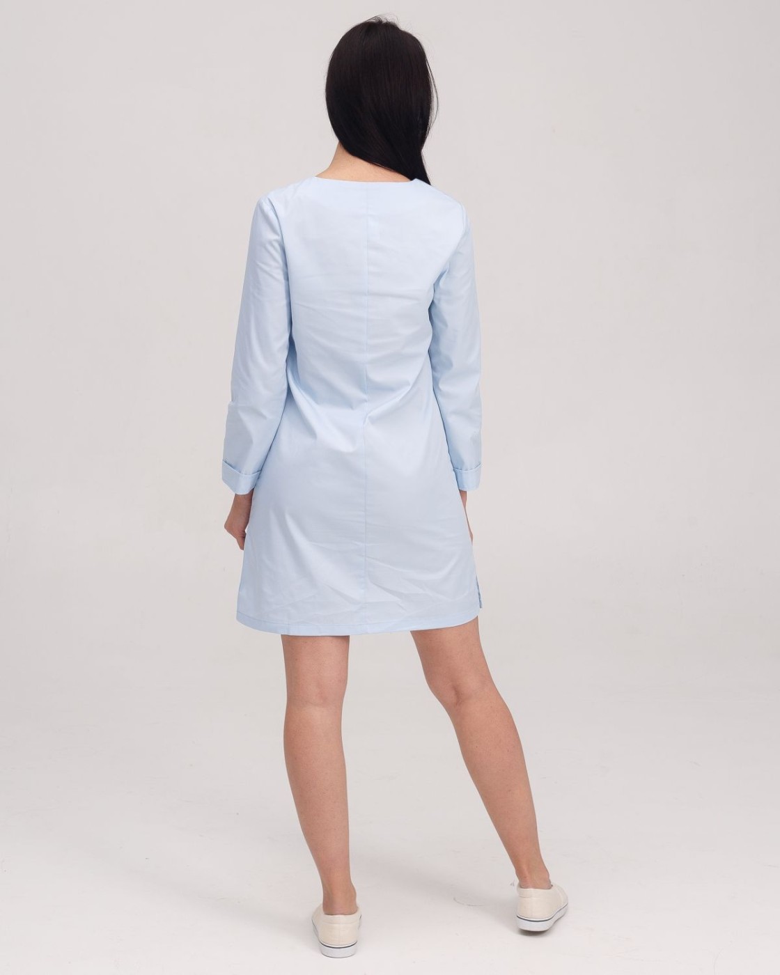 Напівприталений халат довжиною до колін. Практична довжина рукава 7/8, лівий рукав декорований брендованою нашивкою. Халат застібається на ряд потаємних гудзиків, виріз горловини - у формі напівчовника. Є 2 кишені.