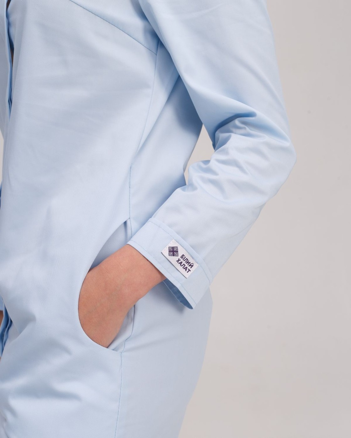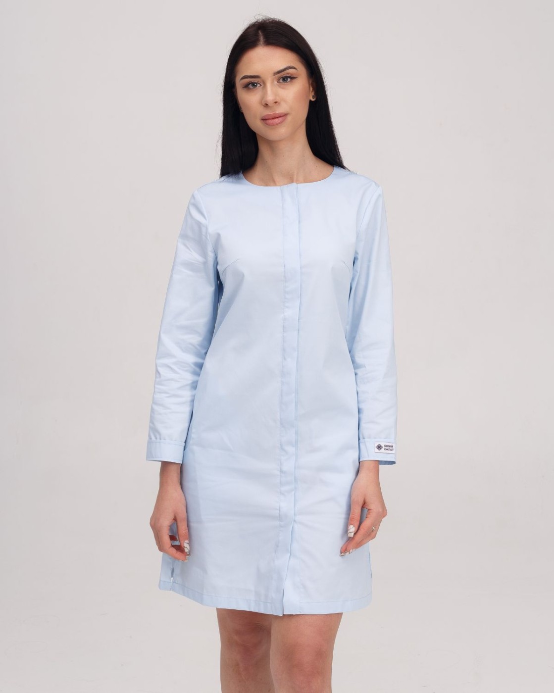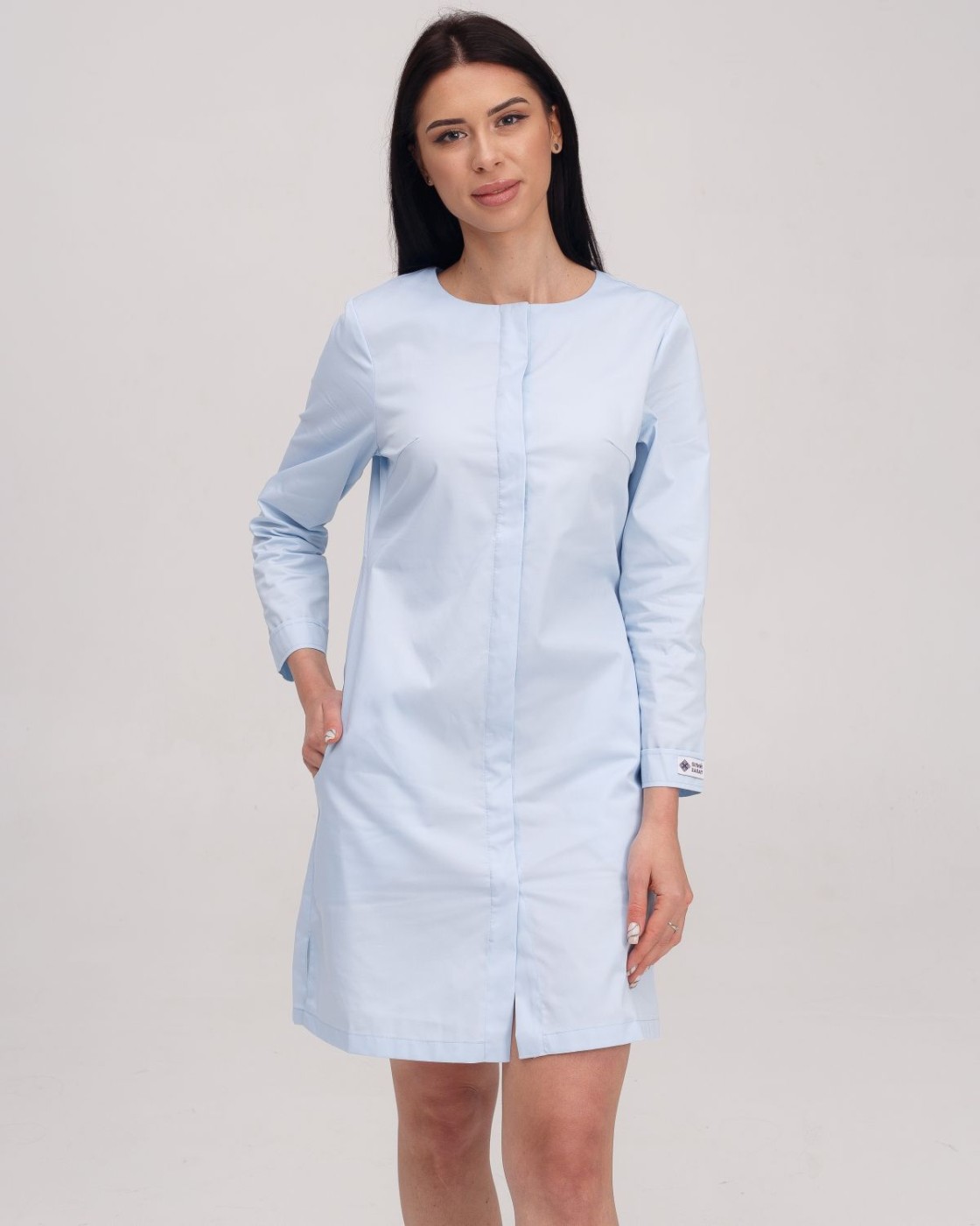 Напівприталений халат довжиною до колін. Практична довжина рукава 7/8, лівий рукав декорований брендованою нашивкою. Халат застібається на ряд потаємних гудзиків, виріз горловини - у формі напівчовника. Є 2 кишені.
