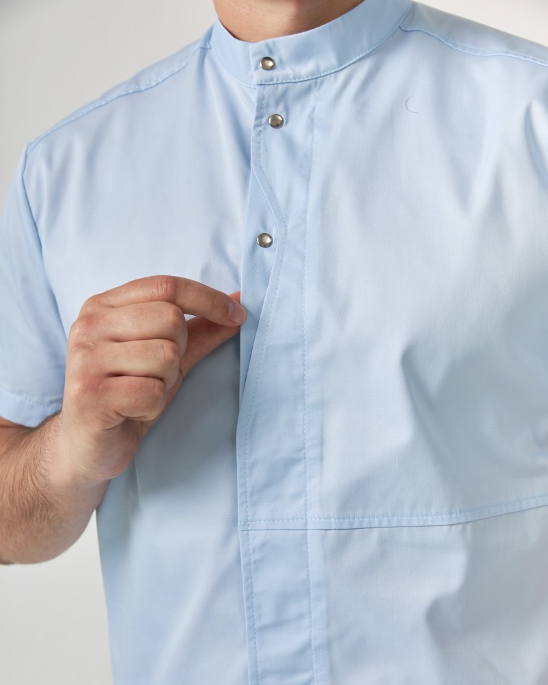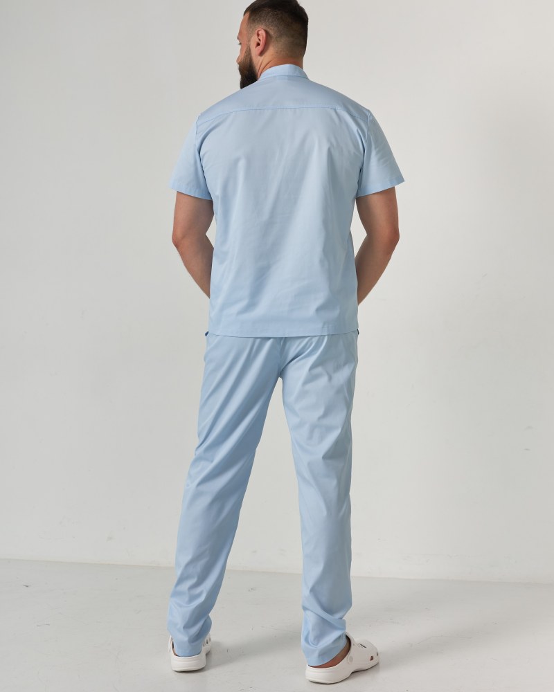 Медичний костюм чоловічий Бостон складається з сорочки на кнопках та штанів. Силует сорочки - прямий, короткий рукав, втачной. Комір-стійка та вшивна планка з фігурними швами додають образу ексклюзивності. Бічні шви з обробленими розрізами роблять медичну сорочку максимально комфортною для будь-якого виду діяльності. Штани - прямі, звужені донизу, з гумкою в області талії. Є глибокі втачні кишені.