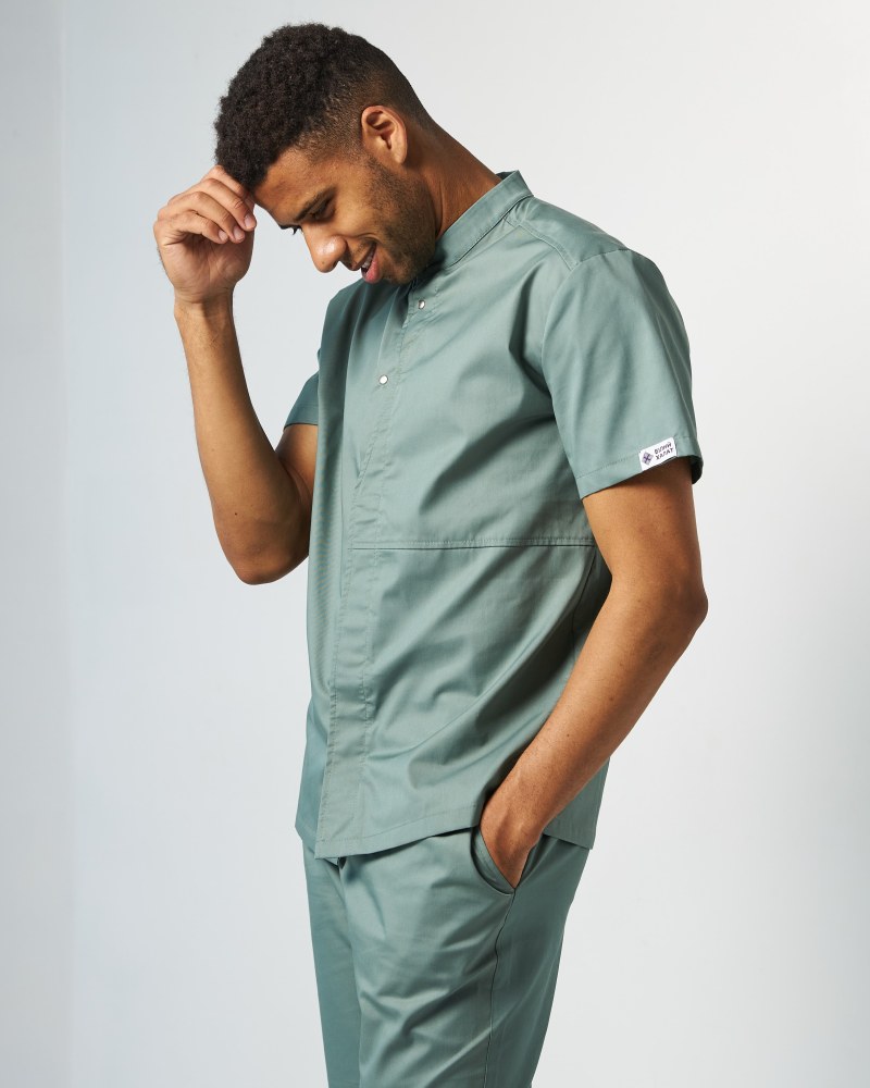 Медичний костюм чоловічий Бостон складається з сорочки на кнопках та штанів. Силует сорочки - прямий, короткий рукав, втачной. Комір-стійка та вшивна планка з фігурними швами додають образу ексклюзивності. Бічні шви з обробленими розрізами роблять медичну сорочку максимально комфортною для будь-якого виду діяльності. Штани - прямі, звужені донизу, з гумкою в області талії. Є глибокі втачні кишені.