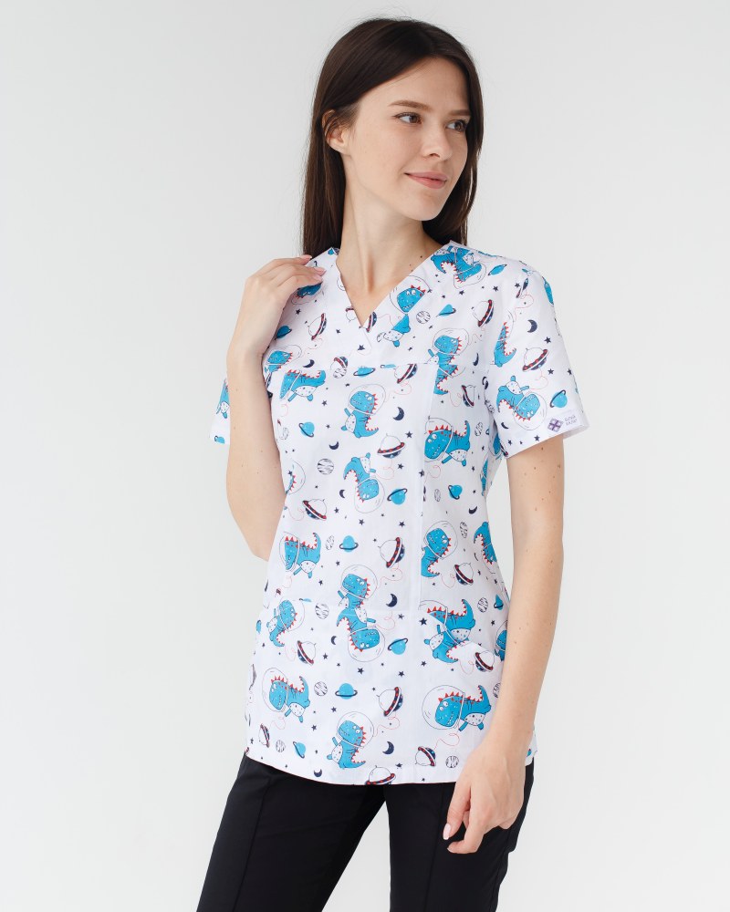 Жіночий костюм “Топаз” декорований принтом складається з медичної сорочки з короткими втачними рукавами, місткою кишенею-кенгуру та медичних штанів з вшитими кишенями.